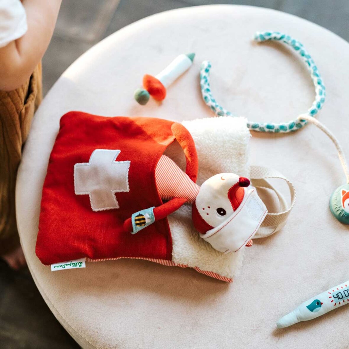 Med alt det medfølgende tilbehør er mulighederne mange. Det hele er samlet i en praktisk doktor taske fra Lilliputiens som også fungere som sygeseng..