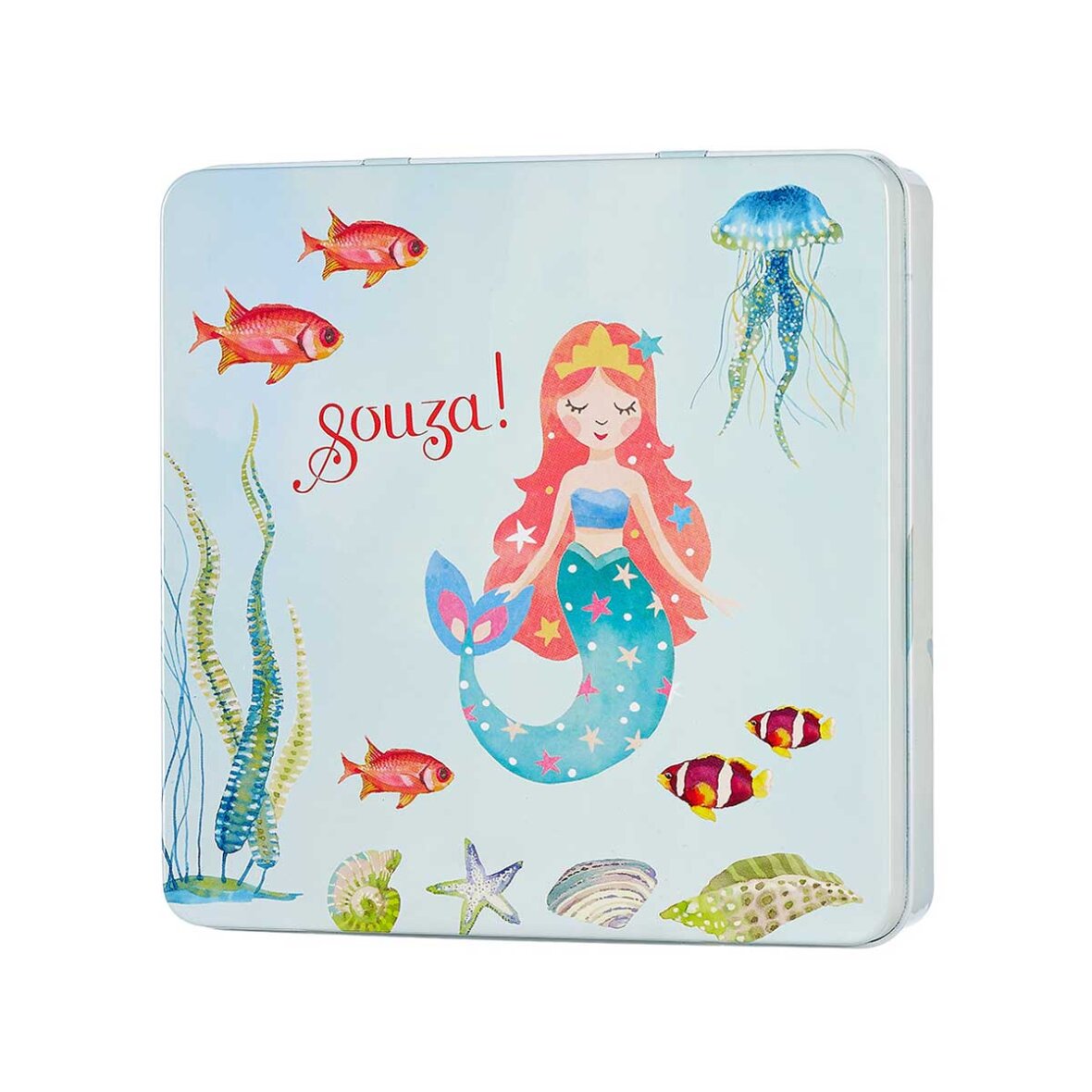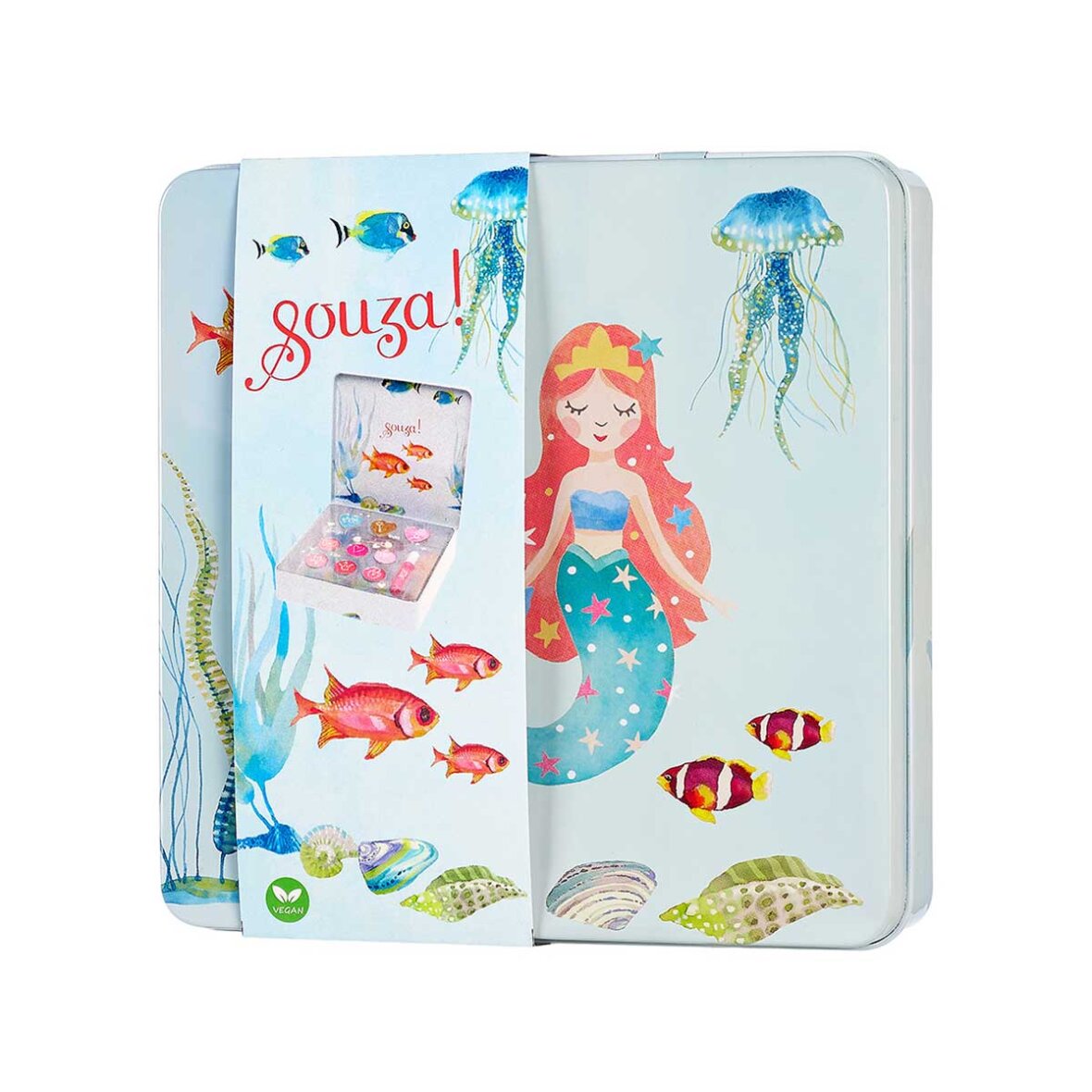 Havfrue makeupsæt fra Souza. Her får du en fin lille æske, som indeholder makeup. Denne æske er perfekt til udklædningslegen.