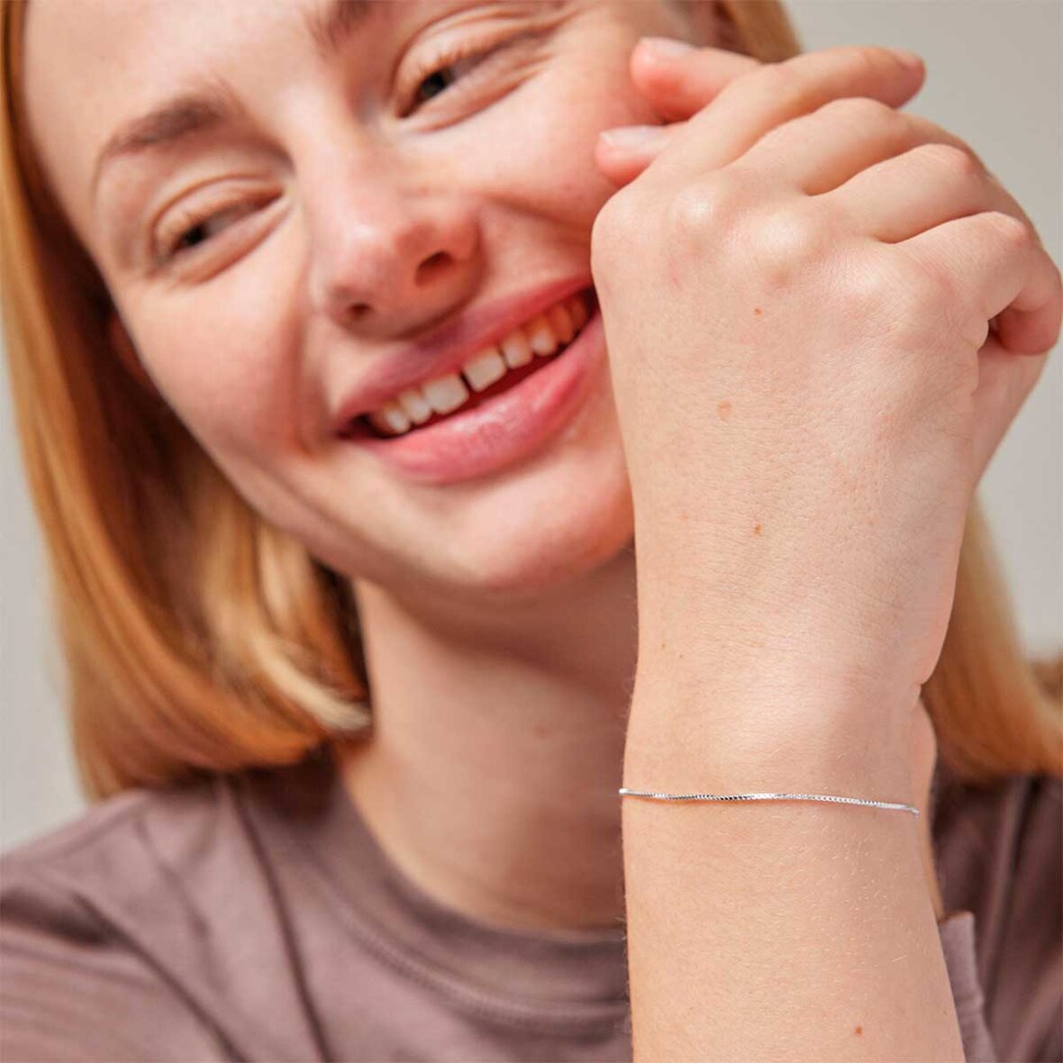 Box chain 0,8mm fra Enamel Copenhagen. Box chain er en firkantet kædetype, som fremstår cool og anderledes, med et skinnende skær. Den er simpel, og går derfor super godt sammen med dine andre armbånd.
