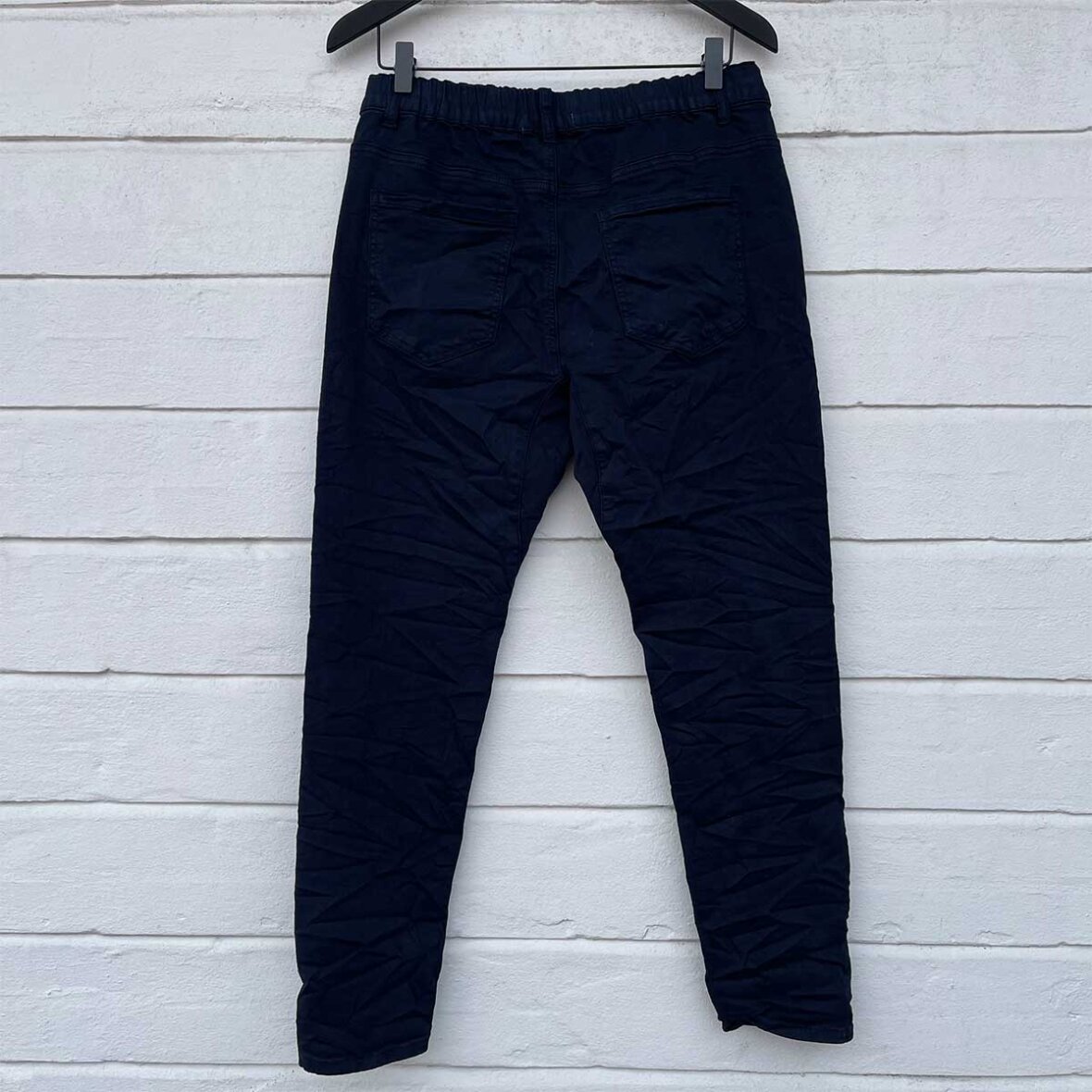 MARIA Bukserne i Navy fra Cabana Living er skabt til dig, der elsker en kombination af klassisk stil og maksimal komfort. Den dybe marineblå nuance giver et elegant og tidløst udtryk, som gør bukserne nemme at bruge til både hverdag og mere polerede looks. Designet byder på en afslappet pasform med elastisk talje og bindebånd, der sikrer en fleksibel og behagelig pasform hele dagen. Sidelommer tilføjer både funktionalitet og et casual touch, mens de let tilspidsede ben giver et flatterende snit.