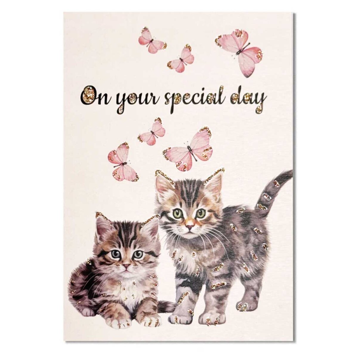 Alle kort er i kraftig og tyk papirs kvalitet og er pyntet med glitter og glimmer. Til hvert enkelt kort medfølger der en mokka farvet kuvert med selvklæbende lukning. Kortet måler 9×13 cm og er dobbeltsidet med har blanke sider indeni til at skrive en personlig hilsen.