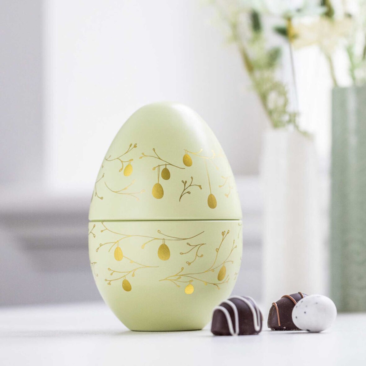 Smukt grønt metalæg fyldt med lækre marcipan- og nougatæg – en lille påskeskat, der både pynter og forkæler. Ægget gemmer på en skøn variation af smage, så hver bid byder på en ny oplevelse.
