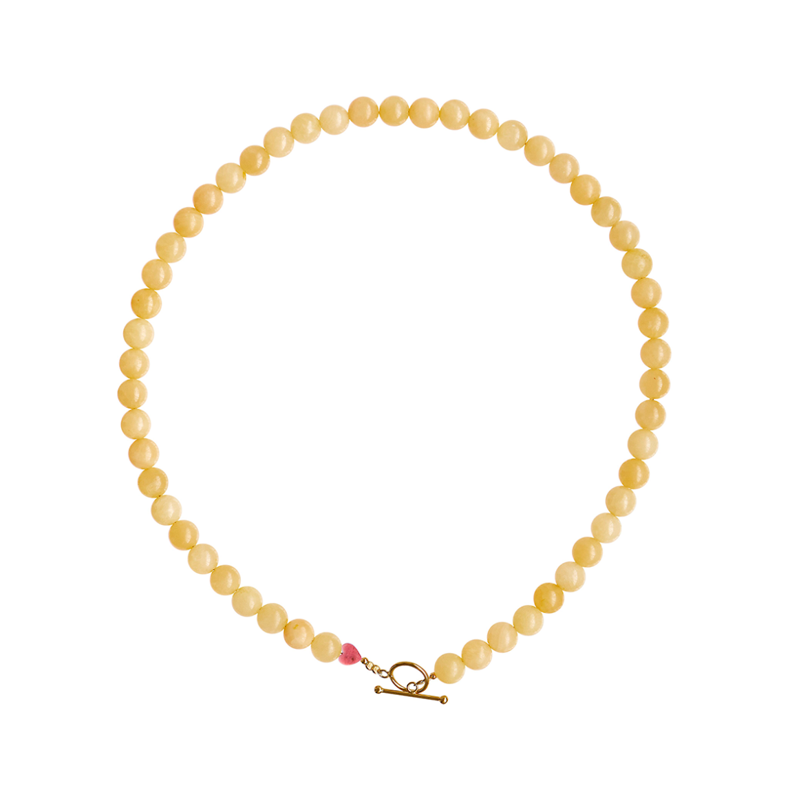 Forårets og sommerens must-have er landet – en halskæde, der emmer af lethed og elegance. Cherie Bon Bon halskæden er sofistikeret og legende på samme tid. Ædelstenens farver changerer på en unik måde, når solens stråler rammer deres overflade. De smukke, gule jadeperle vækker associationer til morgenens første gyldne stråler. Et tidløst smykke, der bringer en følelse af friskhed og ro med sig, uanset hvordan det styles - kombiner halskæden med et par jeans og en t-shirt for et sofistikeret touch eller mix med andre halskæder fra STINE A Jewelry for et mere vovet look.