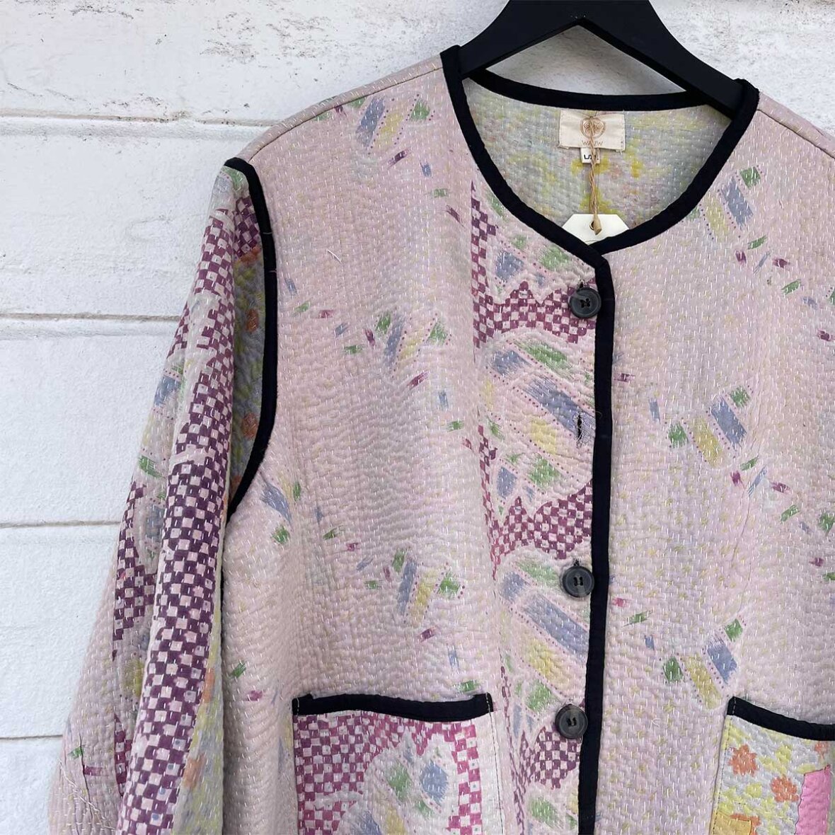 Unika jakke med historie og sjæl. Den er syet af vintage indiske tekstiler i klassisk kantha-stil. Hver jakke er helt unik med sit eget farvespil og mønster. Den er let, behagelig og perfekt til lag-på-lag året rundt.