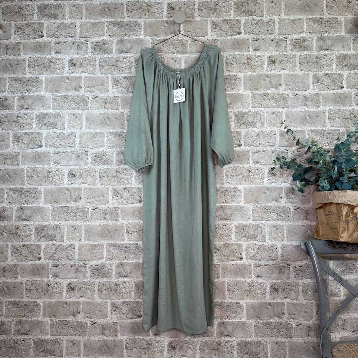 Lanis kjole i en blød og åndbar blanding af hør og viscose, der giver en let og behagelig fornemmelse. Kjolen er designet i et rummeligt onesize snit med lange ærmer og en elegant længde, som skaber en flydende og sofistikeret silhuet.