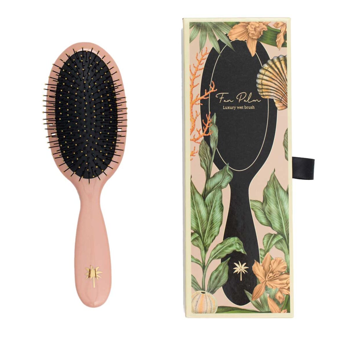 Fan Palm Wet Brush – Fine, faste børstehår med bløde, gyldne spidser, der glider gennem vådt hår og skånsomt løsner knuder uden at skabe brud. Børsterne føles behagelige på hovedbunden og stimulerer cirkulationen, mens den sorte pude fordeler trykket jævnt for en glidende børsteoplevelse. Omhyggeligt fremstillet i Korea og leveres i en smuk gaveæske med guldfolie-detaljer.