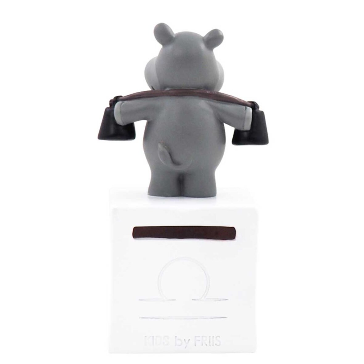 Sparebøssen ligger i den hvide kube som har en charmerende figur på toppen. Denne figur symboliserer Vægt i stjernetegn. På forsiden kan du læse 6 søde egenskaber om stjernetegnet, mens bagsiden har indgravering stjernetegnets zodiac-symbol samt en horisontal pengesprække. I bunden findes det praktiske drejelåg, der gør det nemt at tømme bøssen for mønter.