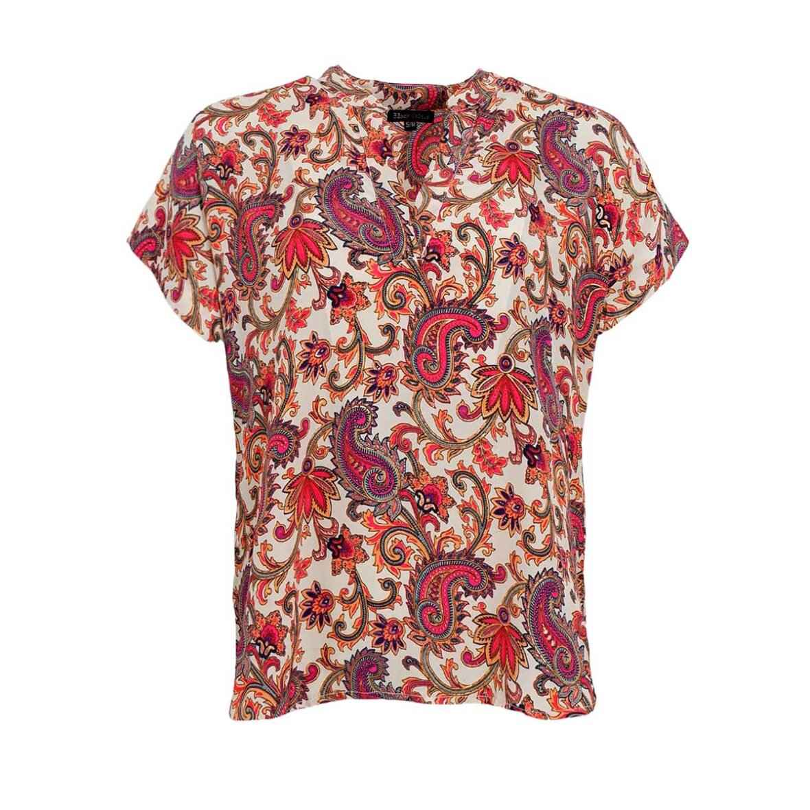 Denne bluse med V-hals og korte ærmer kombinerer et klassisk snit med et let og moderne design. Den enkle stil og den bløde polyester gør den både komfortabel og alsidig – perfekt til både hverdag og mere formelle anledninger.