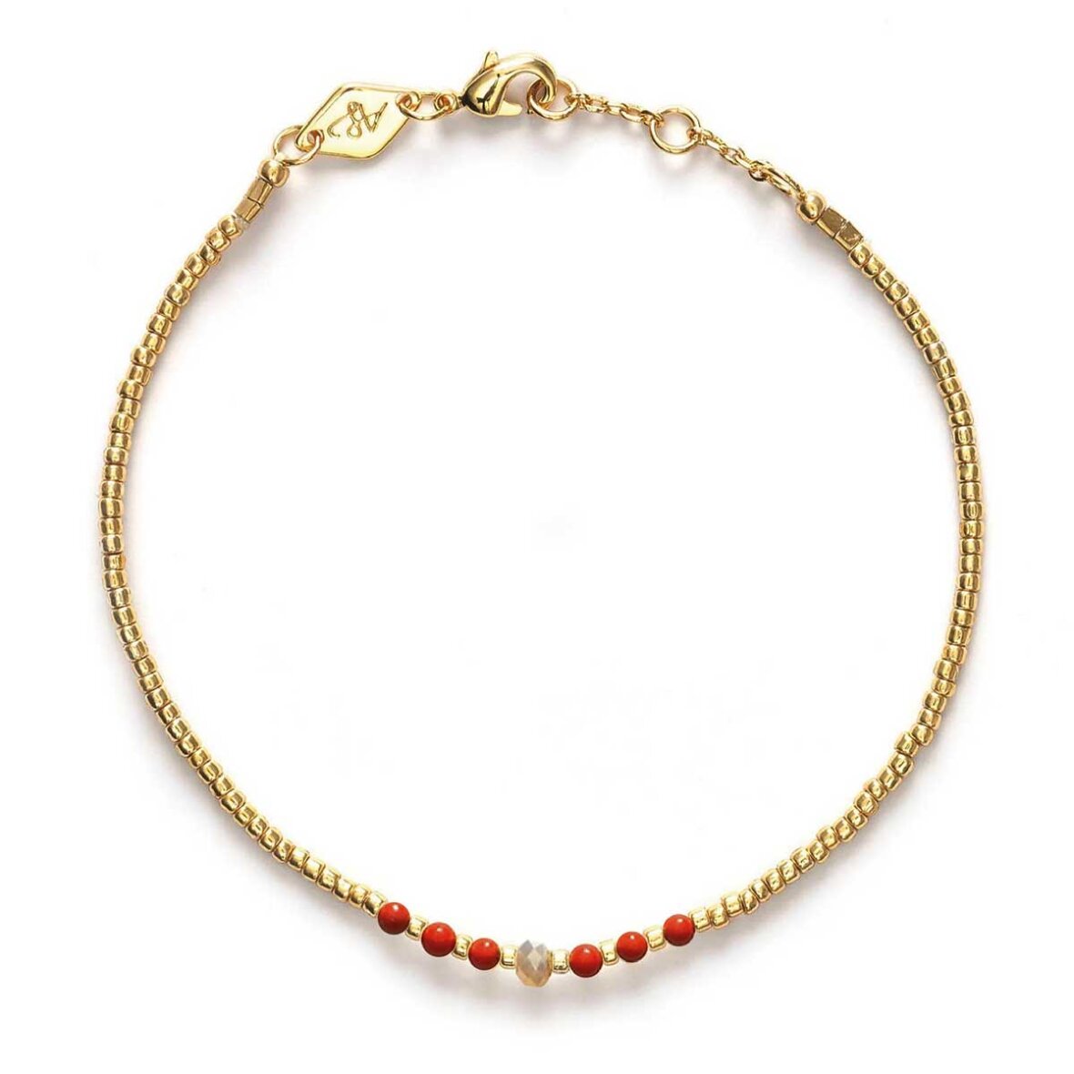 Et håndlavet armbånd med perler og sten, der kombinerer enkelthed med et elegant twist. Farven corail er en smuk rød farve, som får lov til at shine mellem de guld perler.