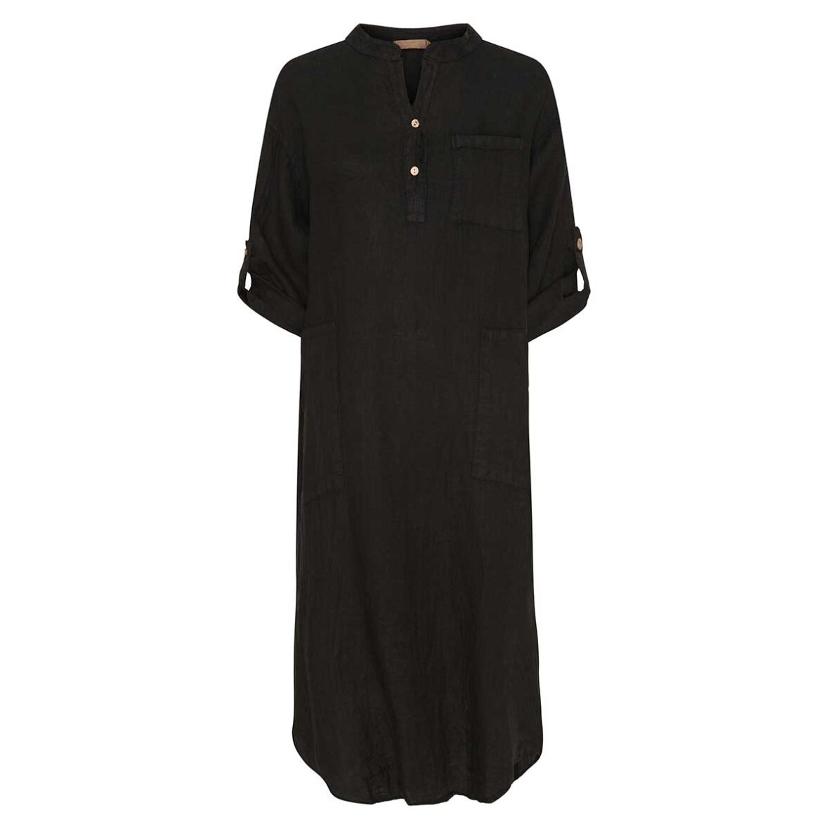 En let og afslappet kjole i 100 % hør med V-udskæring, brystlomme og to sidelommer. Den sorte farve giver et klassisk og stilrent udtryk, som nemt kan bruges både til hverdag og lidt finere anledninger.