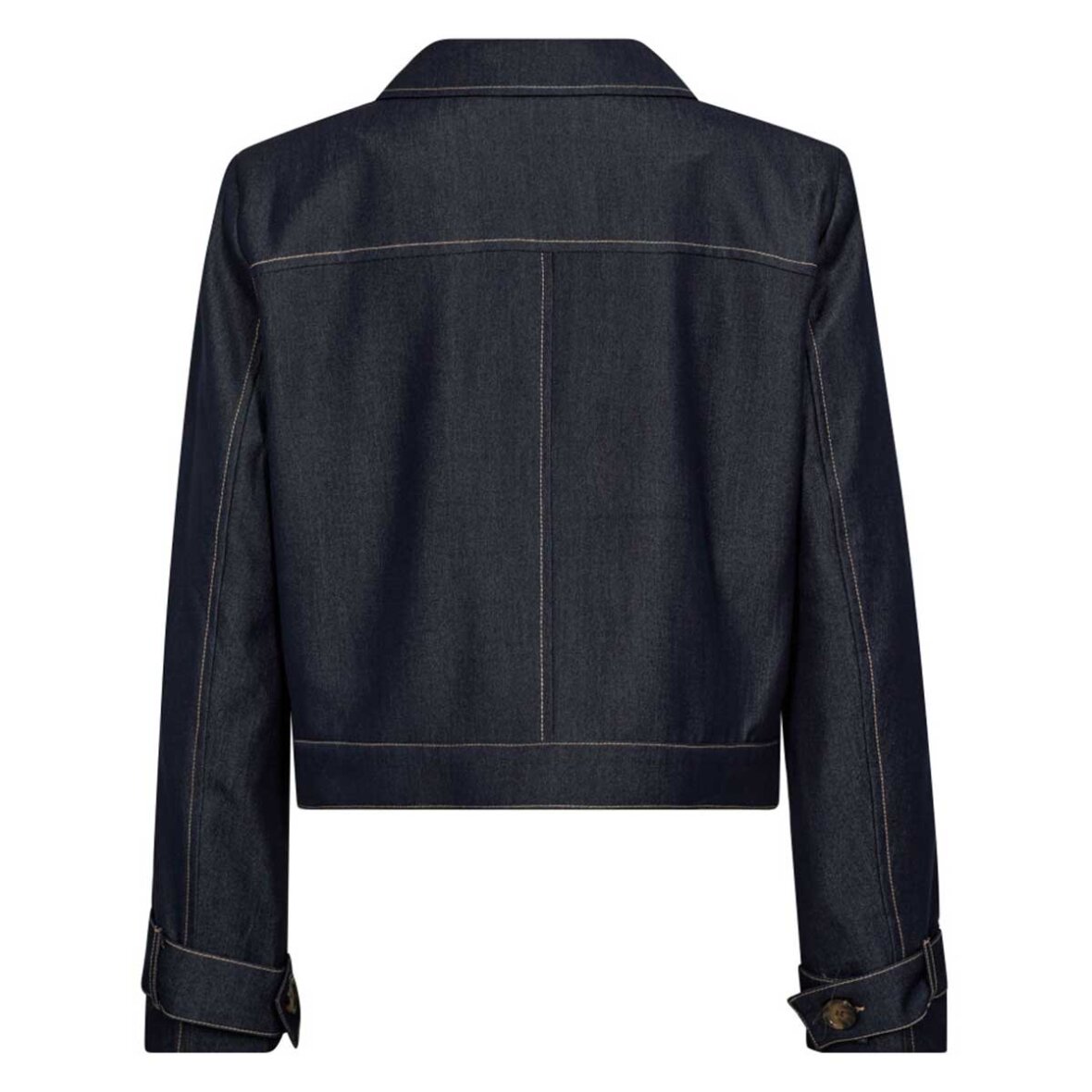 Mørk denimjakke fra Co'Couture med cropped design, der tilføjer et moderne twist til det klassiske denimlook. Jakken har en skjortekrave, knaplukning foran og to praktiske lommer på fronten. De kontrasterende syninger fremhæver jakkens karakter og giver et råt, stilfuldt udtryk. Lange ærmer med knapper og en regular fit sikrer komfort og alsidighed.