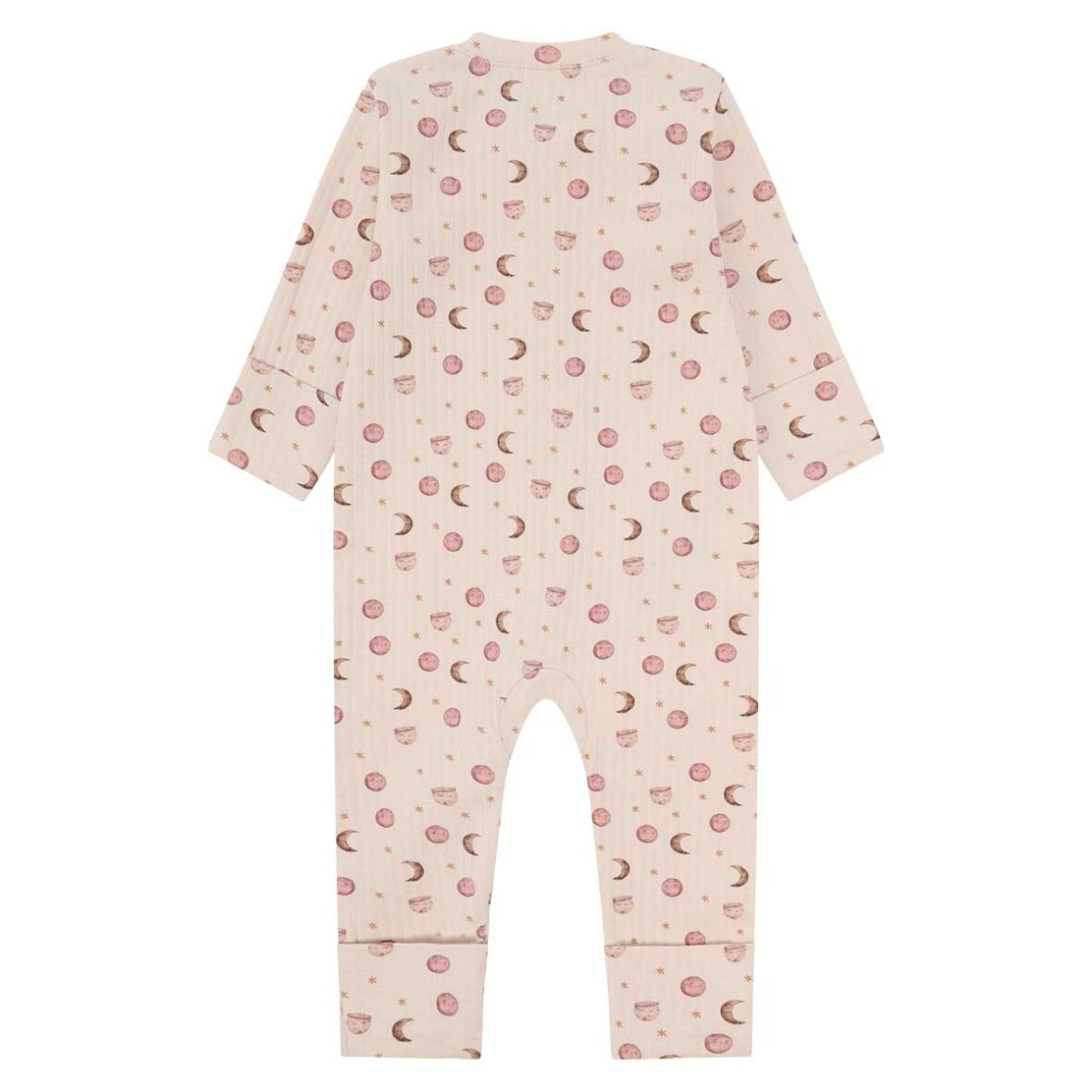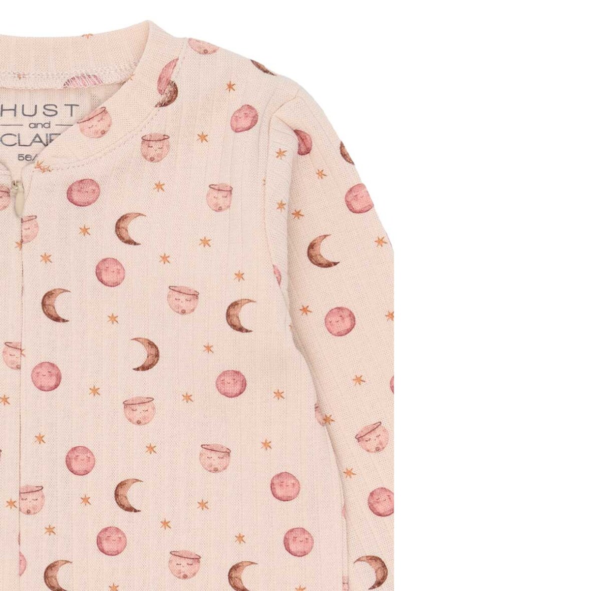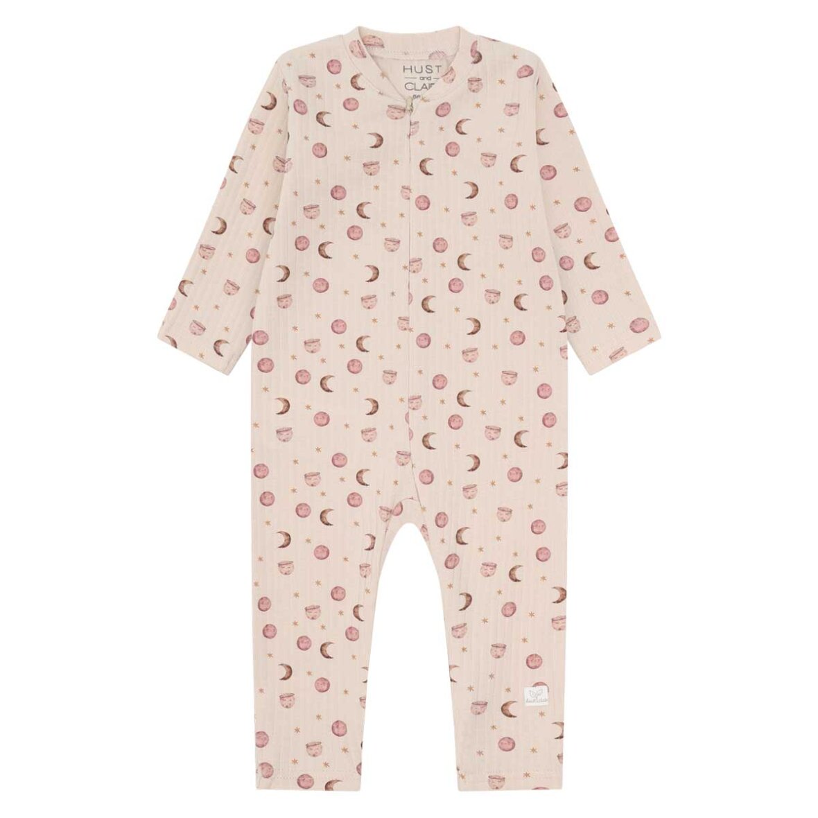 GOTS-certificeret natdragt fra Hust and Claire i farven Gray Morn eller French Oak. Dragten har en ribbet struktur og et sødt måneprint over hele stoffet, som giver et blødt og hyggeligt udtryk. Den centrerede lynlås gør det nemt at klæde barnet på, og de foldbare benkanter kan omdannes til små, varme sokker – perfekt til kølige nætter.