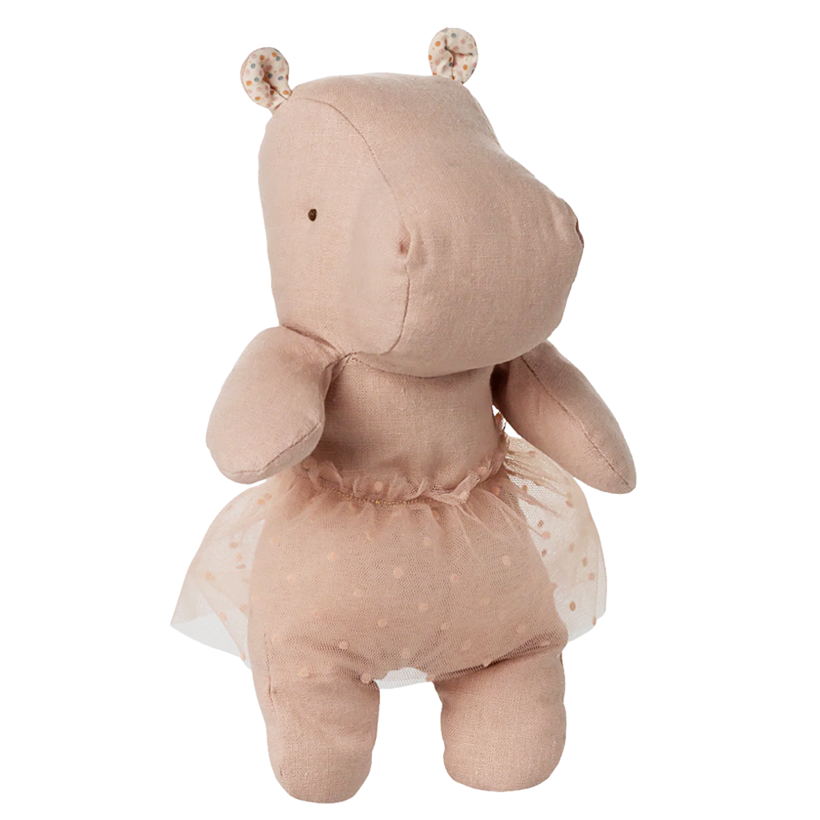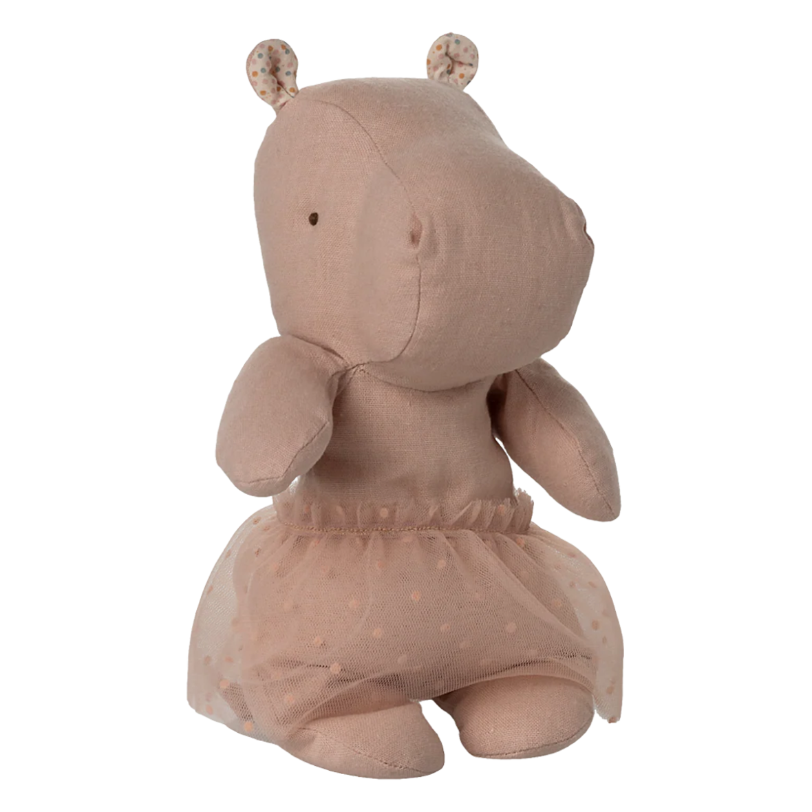 Safari Friends er lavet af blødt stof og fås i mange skønne farver. De kan sidde selv takket være bønner i bagenden og venter på et kram. De små flodheste er pyntet med smukke ballerina-tylskørter, som gør dem ekstra charmerende.