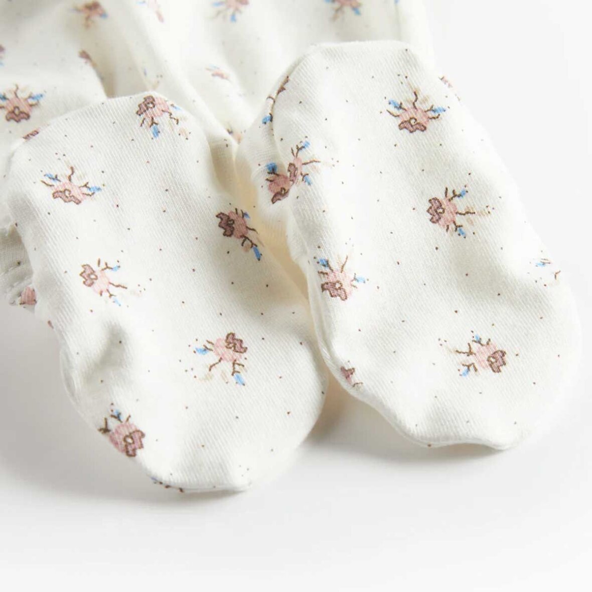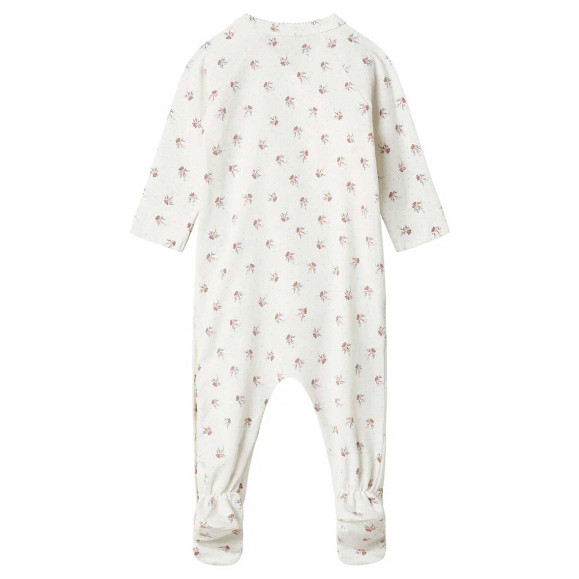 Langærmet heldragt med fødder, perfekt til nyfødte. Dragten har en praktisk slå-om-lukning med trykknapper og et bindebånd, der går fra halsen og ned langs det ene ben. Det fine print og det bløde, strækbare materiale sikrer både komfort og bevægelsesfrihed for de allermindste.
