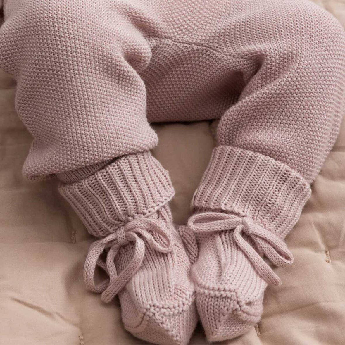 Søde futter i blød perlestrik med bindebånd, skabt til at holde de mindstes fødder varme og komfortable. De er både bløde, varme og rare at have på – perfekte til små babyfødder.