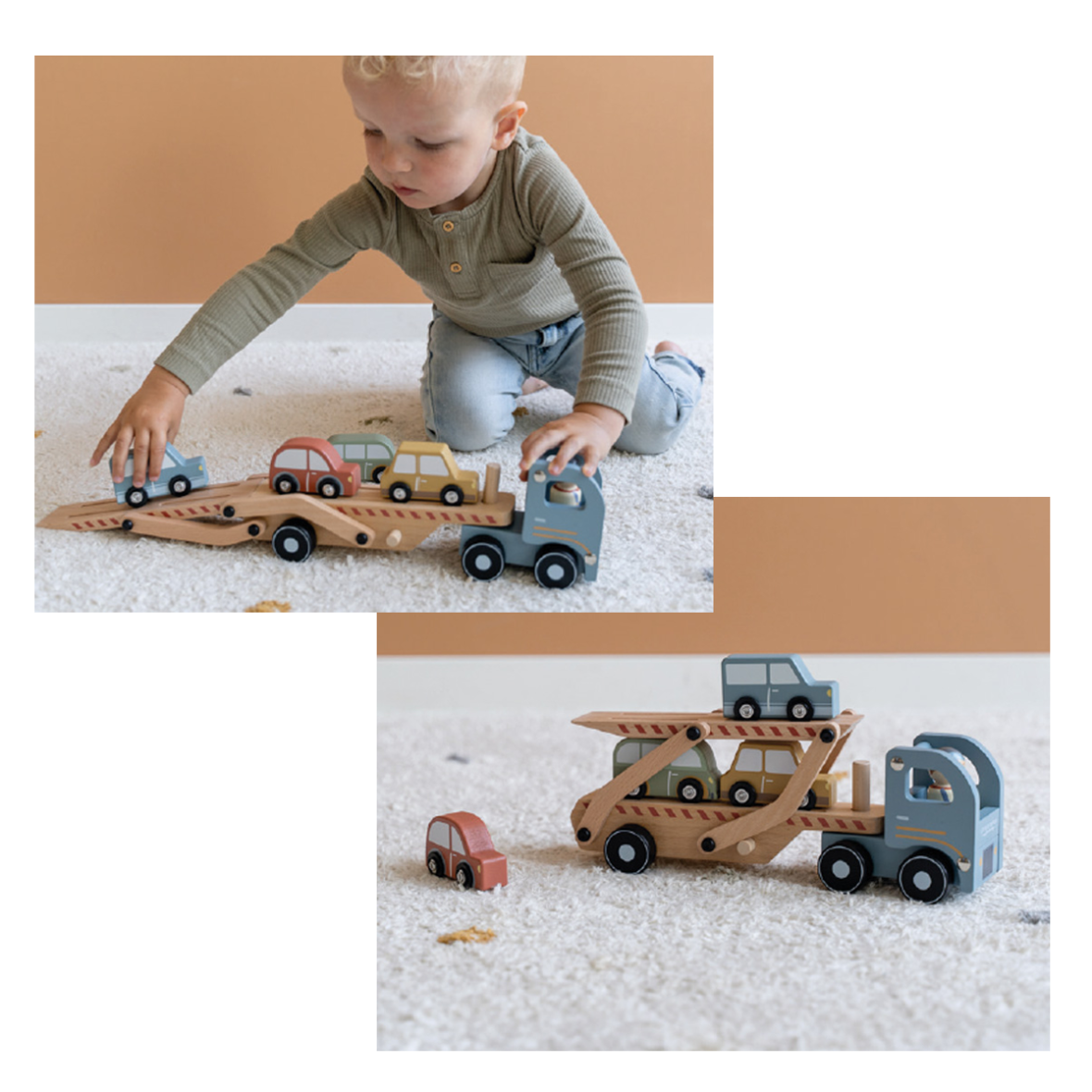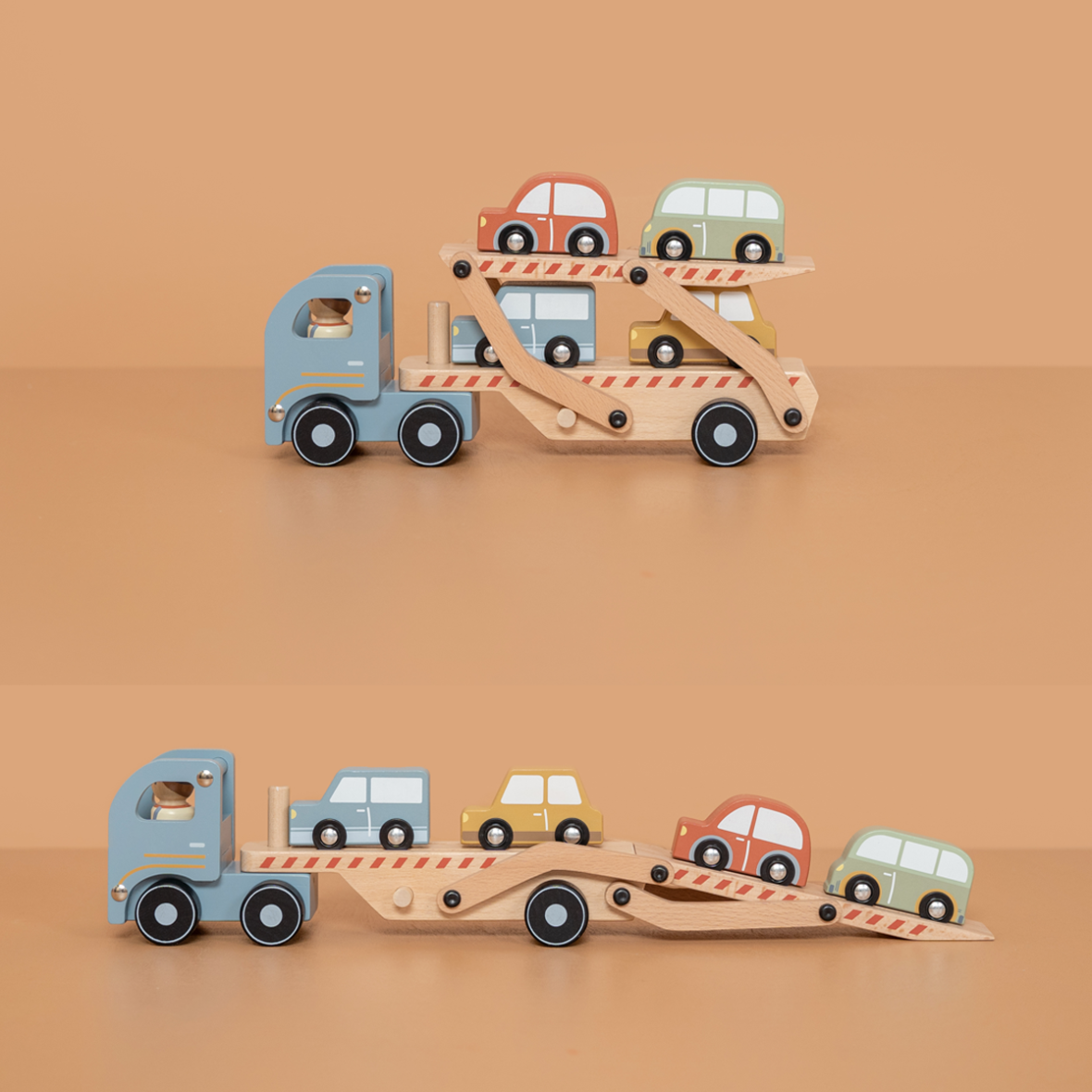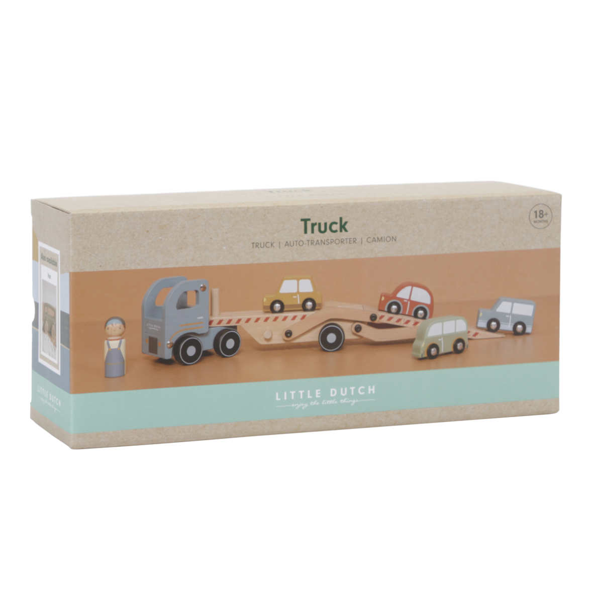 Indhold: 1 transportlastbil i træ, 4 små biler og 1 figur