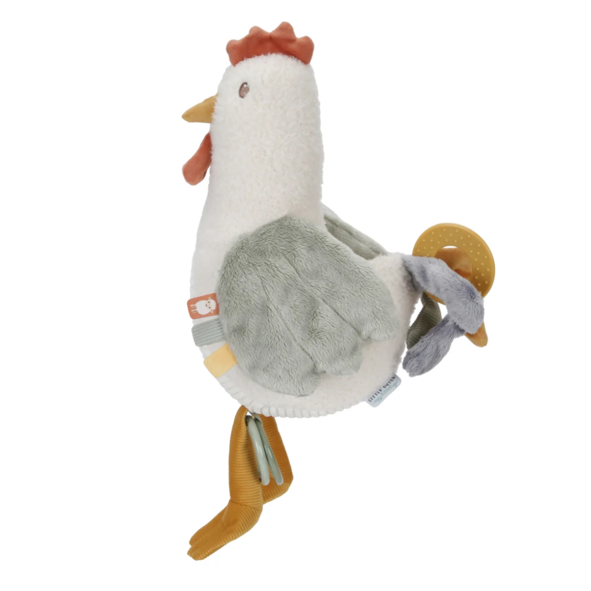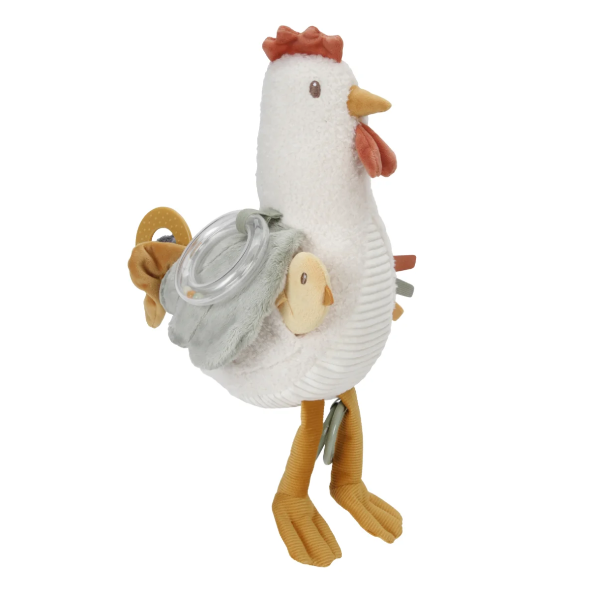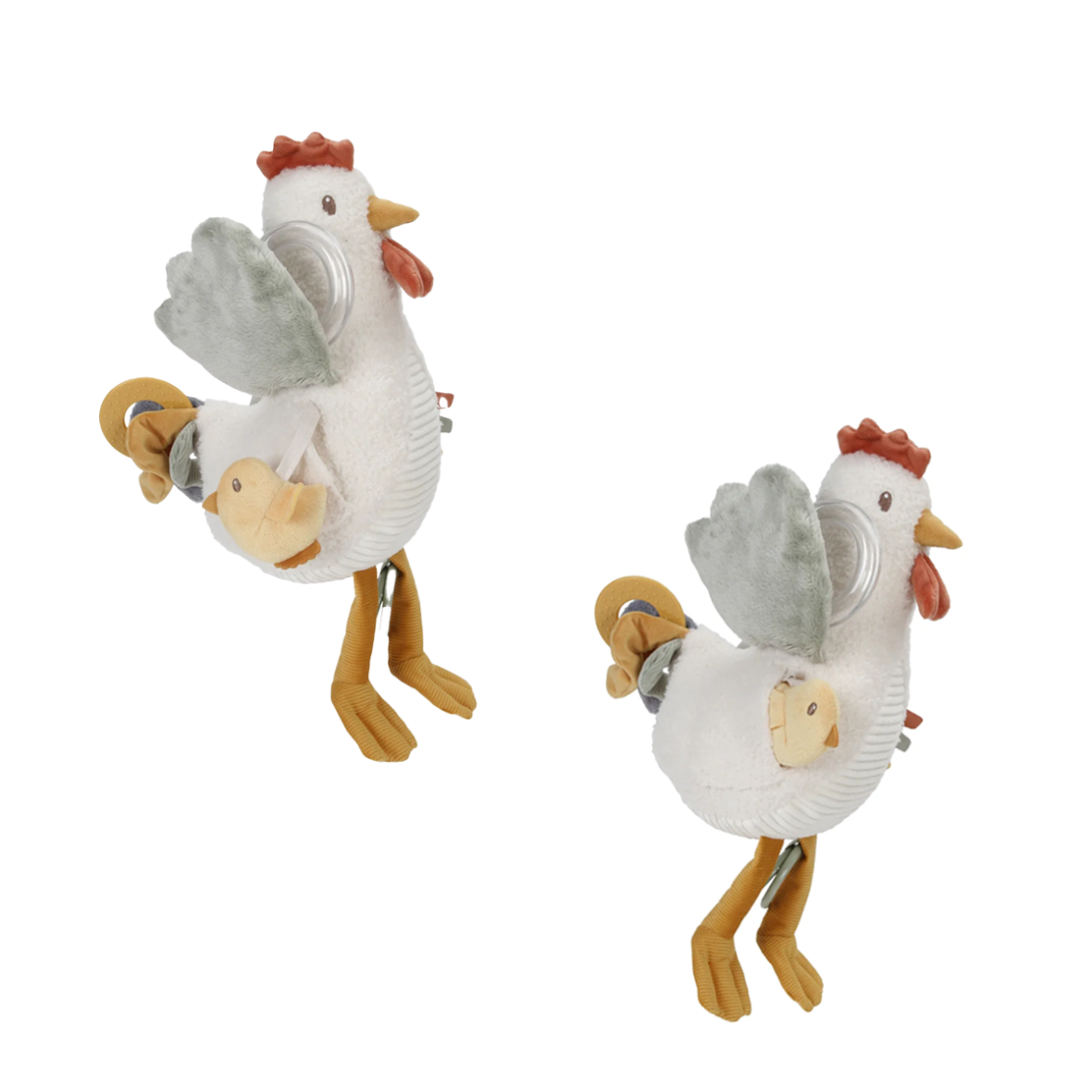 Mød din babys nye yndlingslegekammerat! Denne bløde aktivitets-høne er fyldt med spændende detaljer, der indbyder til leg og opdagelse. Med raslende lyde, knitrende fjer og farverige mærkater fanger den hurtigt barnets opmærksomhed og stimulerer både sanser og nysgerrighed. Under den ene vinge finder du en lomme med en lille kylling - en ekstra blød ven der er sjov at røre ved. Perfekt som første sanselige legetøj.