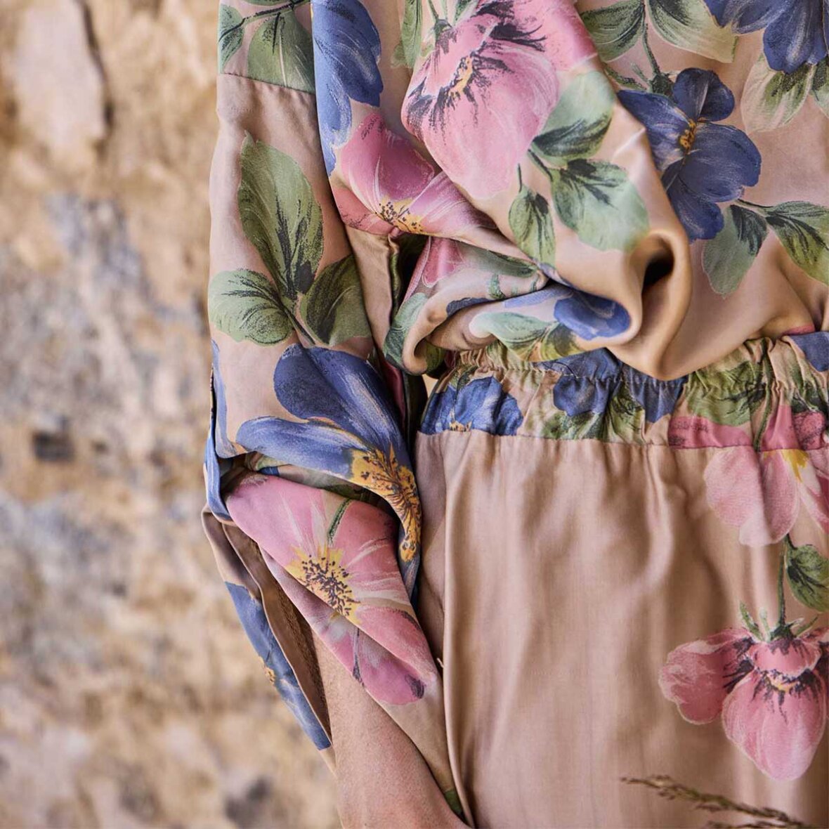 Bukser i viscose satin med smukt blomsterprint. Bukserne er designet uden yderligere sidesømme og lommer for at fremhæve printets finesse.