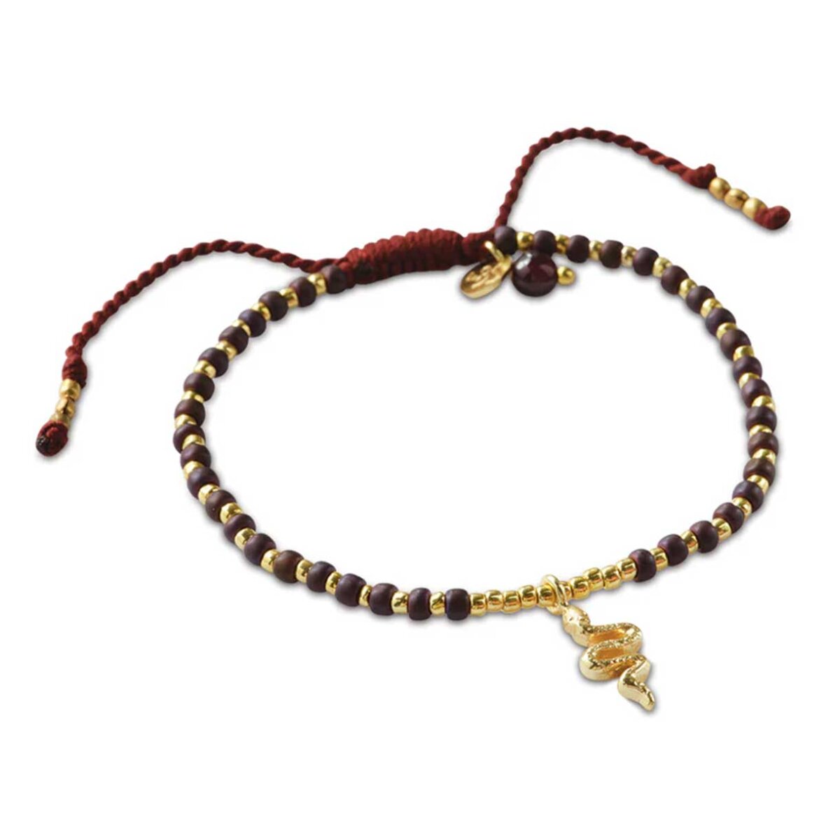 Oplev det smukke Hoping Garnet armbånd, der er sammensat af glasperler og guldfarvede perler, prydet med en guldbelagt charm og en lille rund granatsten. Armbåndet lukkes med en justerbar slidknude af bomuldstråd med messingperler og passer til håndled fra 16 til 20 cm. Granat hjælper dig med at genfinde din energi og indre styrke.