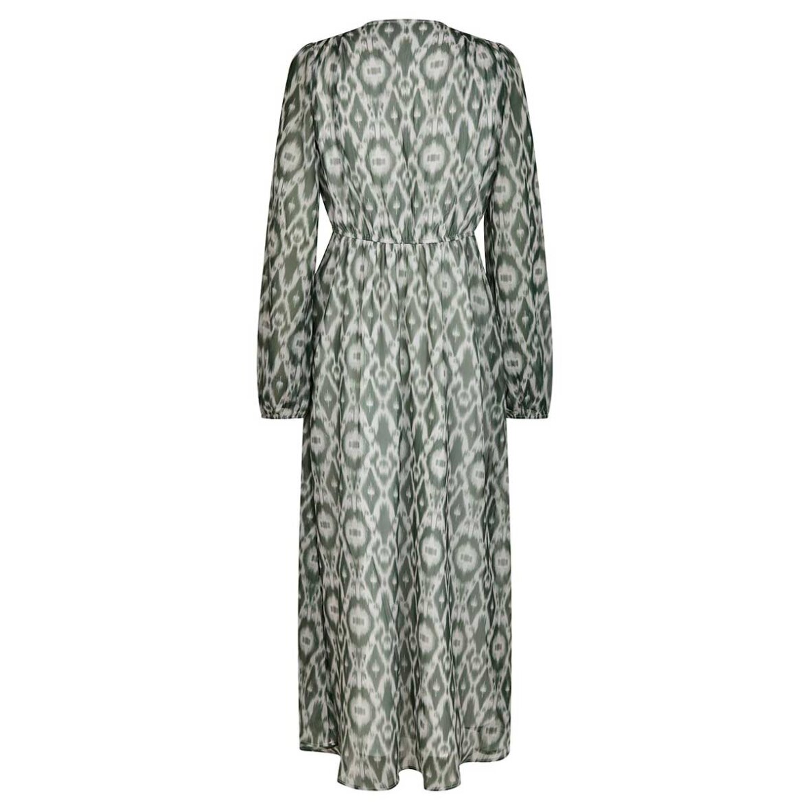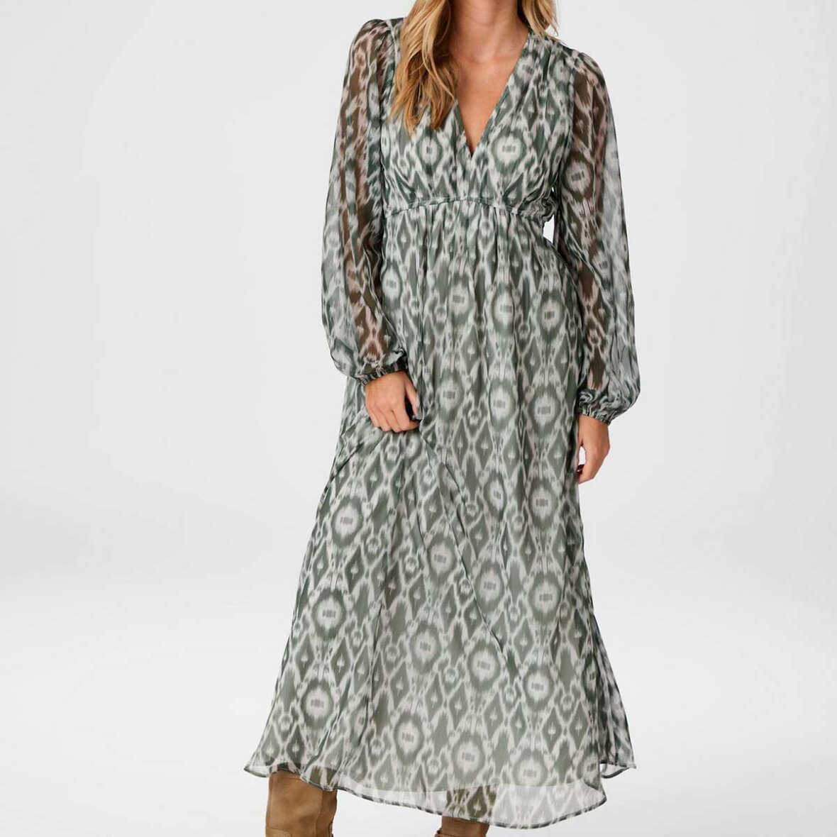 Maxi-længde kjole med smukt grafisk print og en afslappet, feminin pasform. Kjolen har lange ærmer, der afsluttes med elastik for komfort og bevægelsesfrihed.