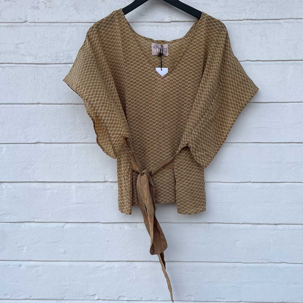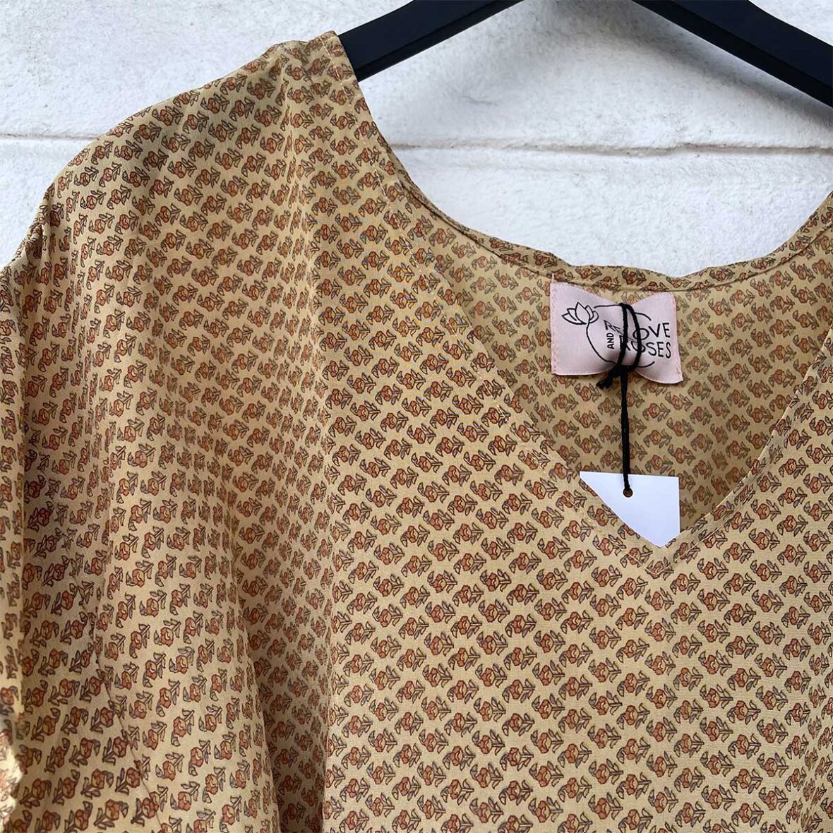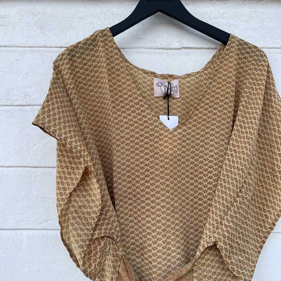 Da denne bluse er syet af vintage silke fra sarier, vil du måske spotte små pletter, løse tråde eller fine huller – se dem som kærlige spor fra tekstilets tidligere liv.