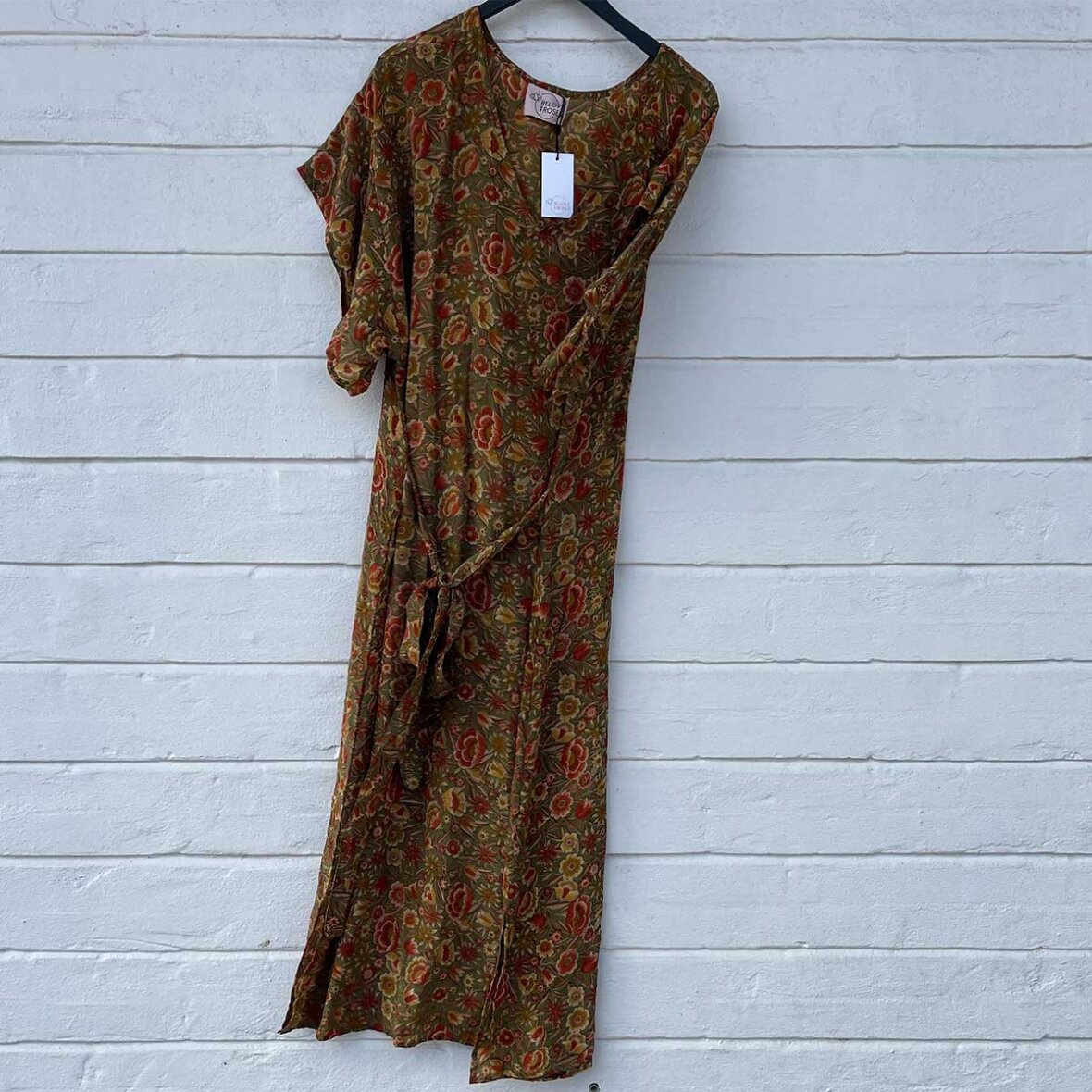 En elegant og bæredygtig silke‑kjole i brandets karakteristiske stil. Kjolen er syet af upcyclet vintage saris i silke og tilbyder en unik tekstur og farvetone.