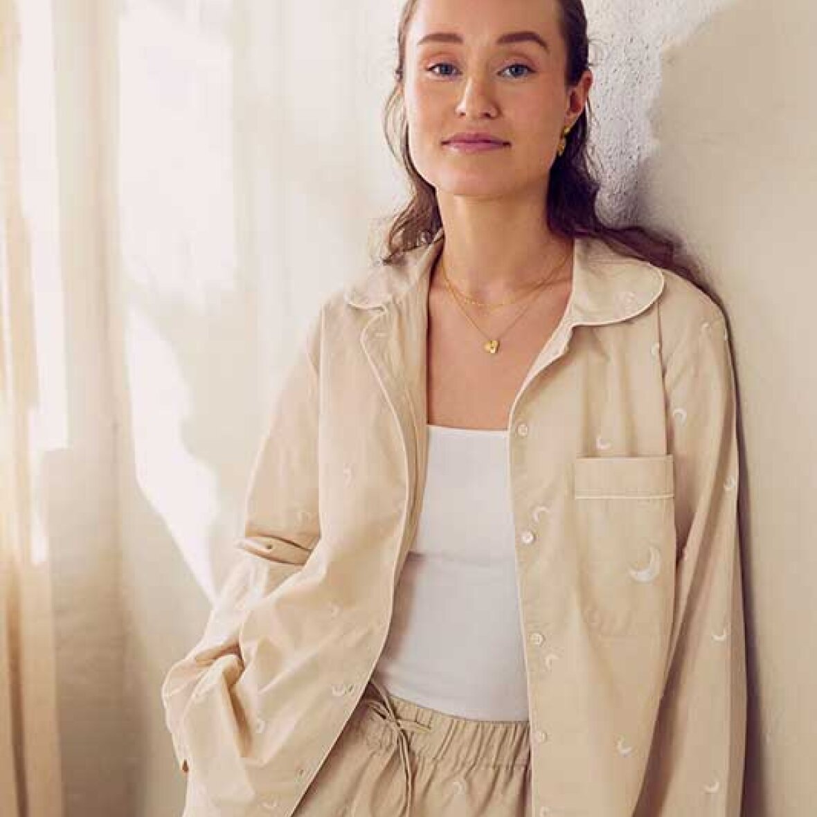 Fin Moe Pyjamas Skjorte med smukke broderede halvmåner, der tilfører et subtilt og drømmende mønster, kombineret med elegante kontrastfarver, som fremhæver detaljerne og giver skjorten et raffineret udtryk. Perfekt til både komfort og stilfuld nattesøvn, og designet med fokus på blødhed og holdbarhed for en behagelig følelse hele natten.