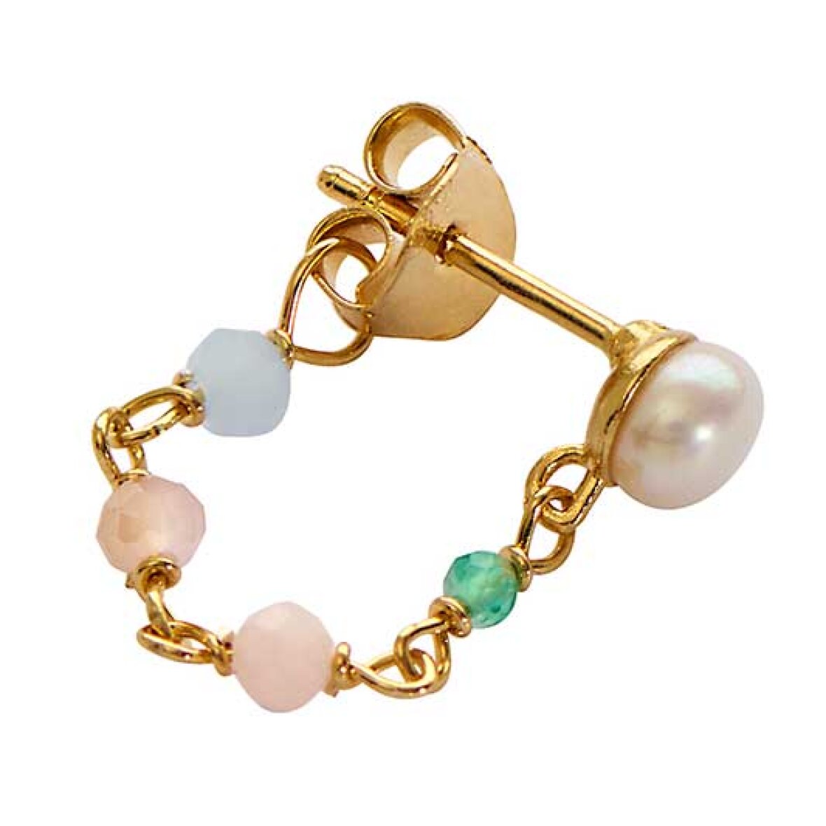 Eventyrlig og unik ørering fra STINE A Jewelry med perle-ørestik og en fin kæde af farverige ædelsten, som elegant snor sig om øreflippen. Kæden er fastgjort i låsen, hvilket skaber et råt og samtidig delikat udtryk med et strejf af boheme.
