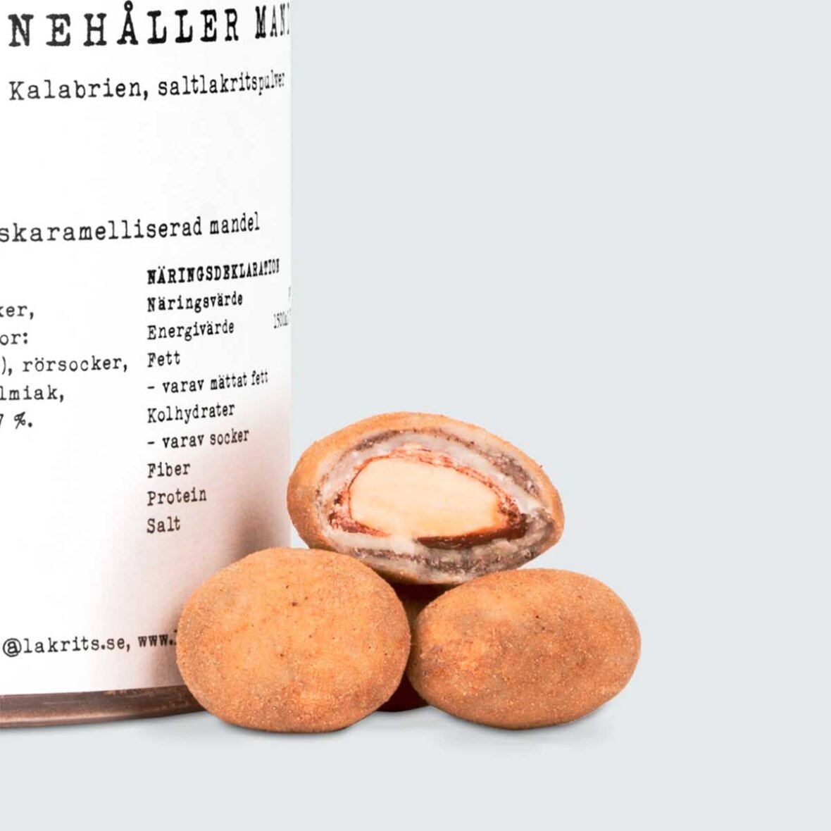 50 % mandel, 50 % hvid chokolade (sukker, kakaosmør, mælkepulver, emulgator: sojalecitin, naturlig vaniljearoma), rørsukker, 5 % rålakrids fra Calabrien, salmiak, honning. Kakaoindhold: Mindst 27 %.