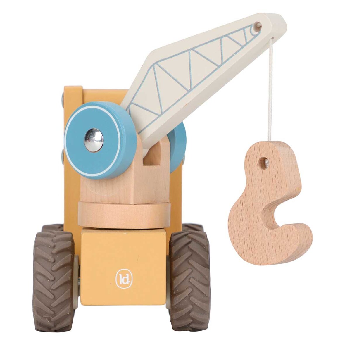Løft og flyt tunge byrder med denne robuste kran! Kranbilen i træ har en roterende arm og leveres med en bygningsarbejder. Gummihjulene sikrer en jævn kørsel hen over byggepladsen. Kør til havnen, læs containerne, og placer dem på det rigtige sted. Kombiner dette kranlegetøj med andre byggekøretøjer for at få uendelig meget sjov. Lad byggeriet begynde!