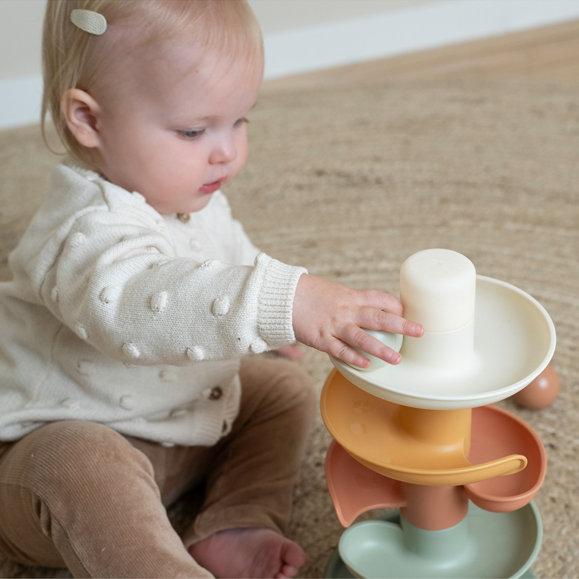 Lad bolden rulle! Det fascinerende spiraltårn søger for masser af spænding. Det farverige legetøj består af 5 bløde dele der er lette at stable for barnet. Slip kuglerne en efter en på toppen og se hvordan hver af dem snor sig og ruller ned. Spiraltårnet forbedrer hånd-øje-koordination og lærer barn om årsag virkning hvilket sikrer, at det er både sjovt og lærerigt. Spiraltårnet kommer med tre store bolde der er lette at holde om og giver lidt lyd når de bevæger sig.