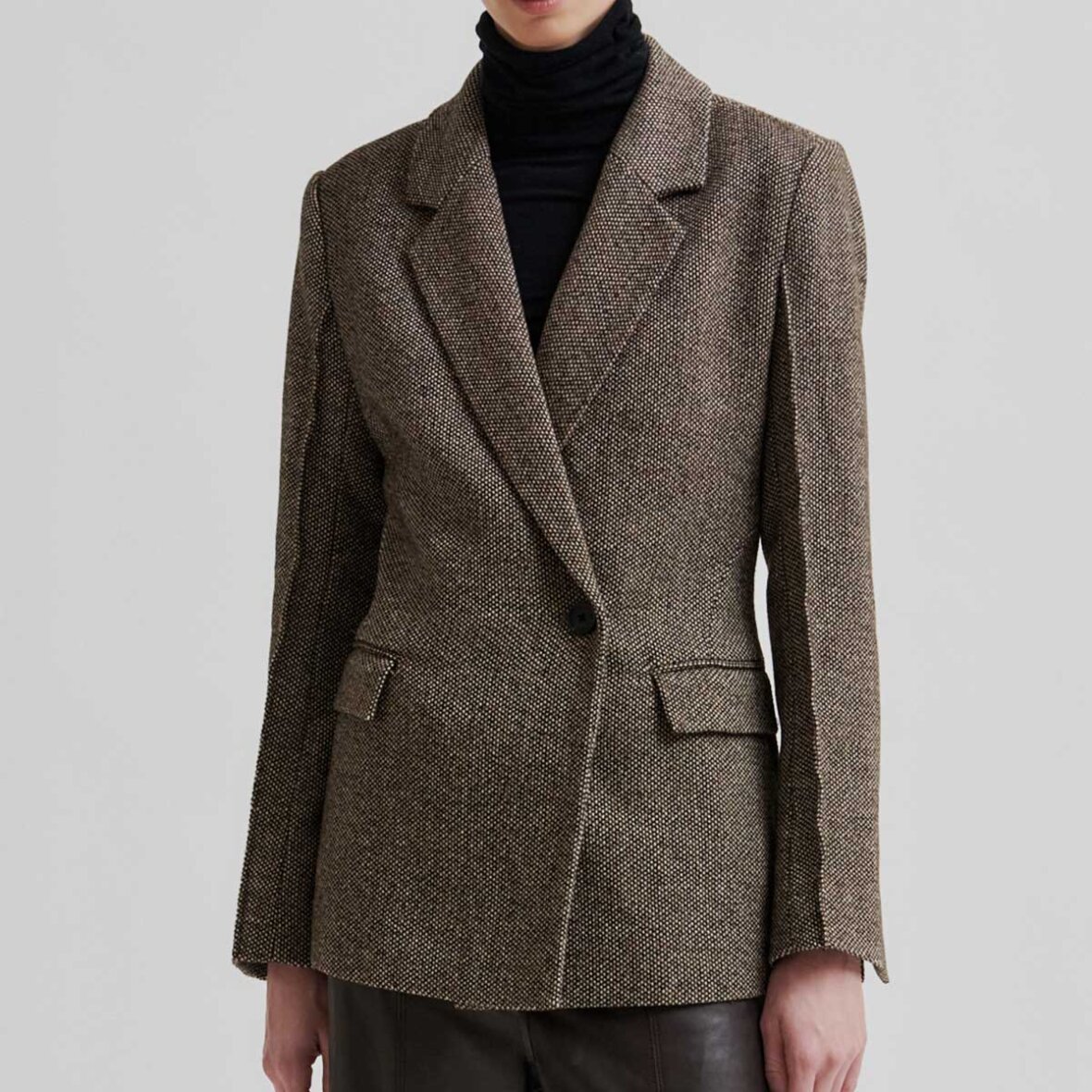 Second Female skræddersyet tweedblazer i en elegant uldblanding med klassisk tweedvævet mønster. Blazeren har hakrevers og en asymmetrisk knaplukning, der giver et moderne twist til det tidløse design. Den er designet med skulderpuder, lange ærmer med stikninger samt små slidser ved manchetterne, hvilket skaber en skarp silhuet. Foran findes to lommer med klap, og bagpå en slids, som understreger den skræddersyede pasform. Blazeren er helforet og figursyet, hvilket gør den både komfortabel og flatterende.