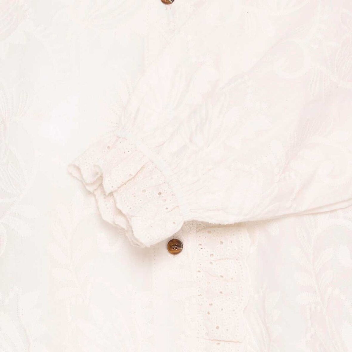 Langærmet skjorte med rund hals og flæsekant rundt i kraven. Knaplukning foran og flæsedetaljer. Almindelig pasform.