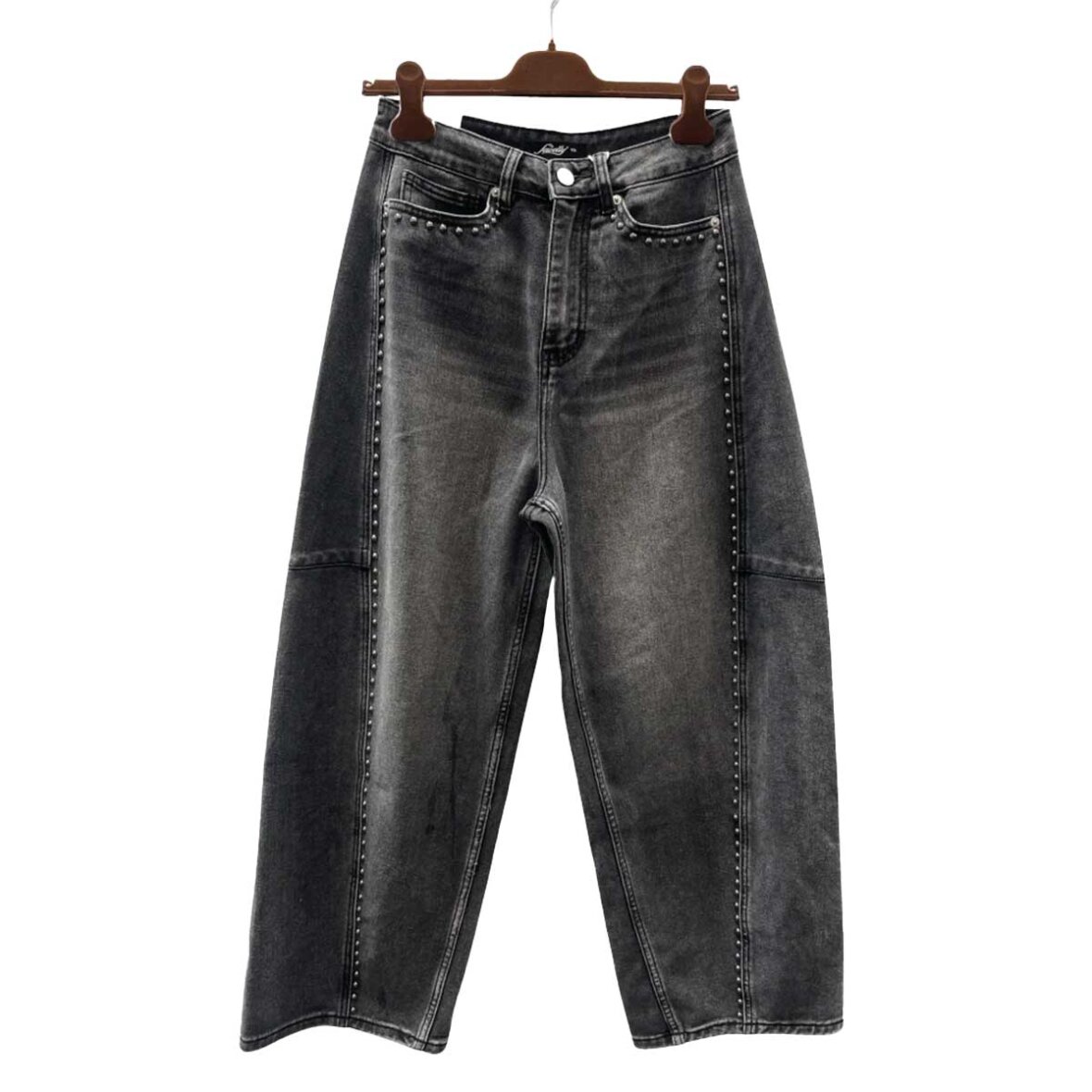 Cool grå jeans i denim med let vidde i lårene, der samler sig forneden. Detaljer med rå nitter giver et stilfuldt touch.