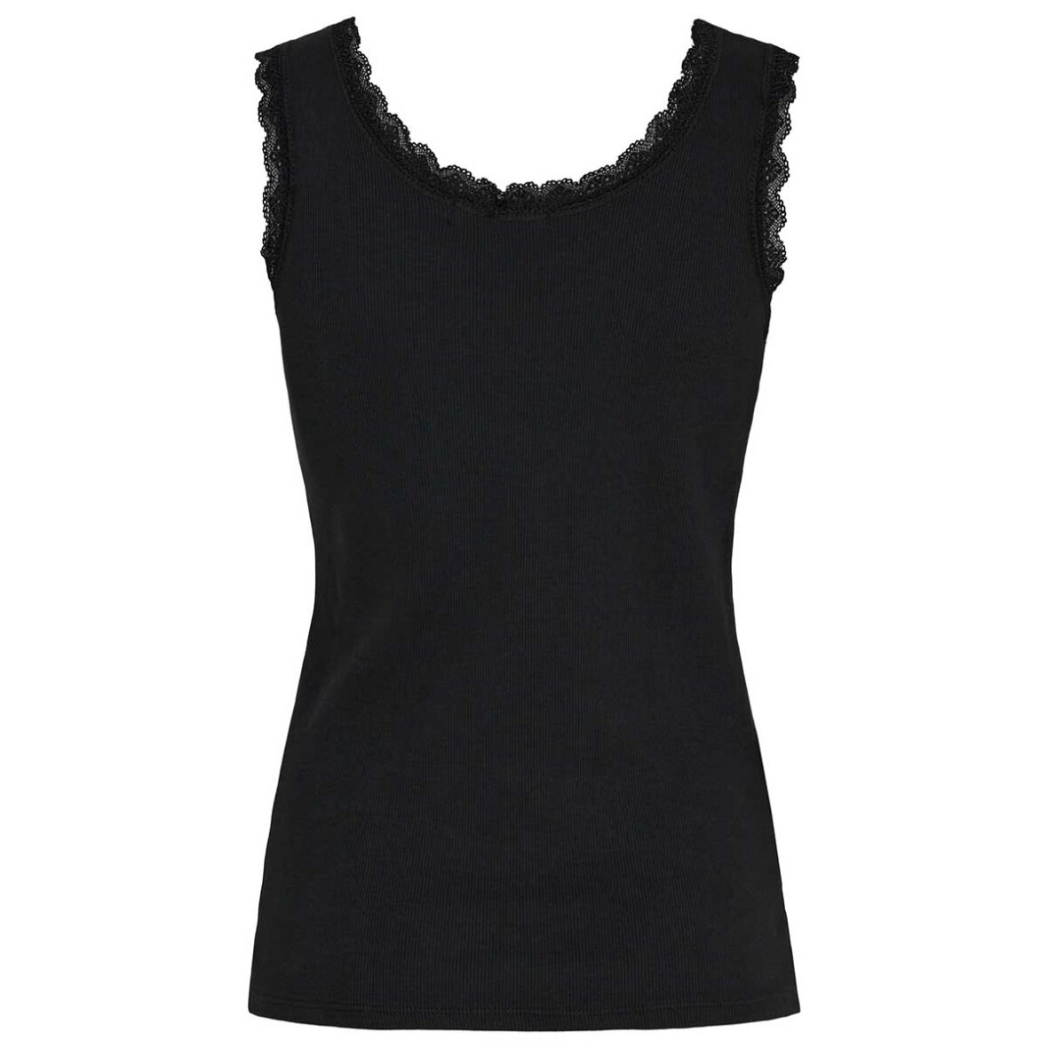 Tanktop med fine blondedetaljer langs hals og ærmegab. Perfekt som basislag eller alene på varme dage.