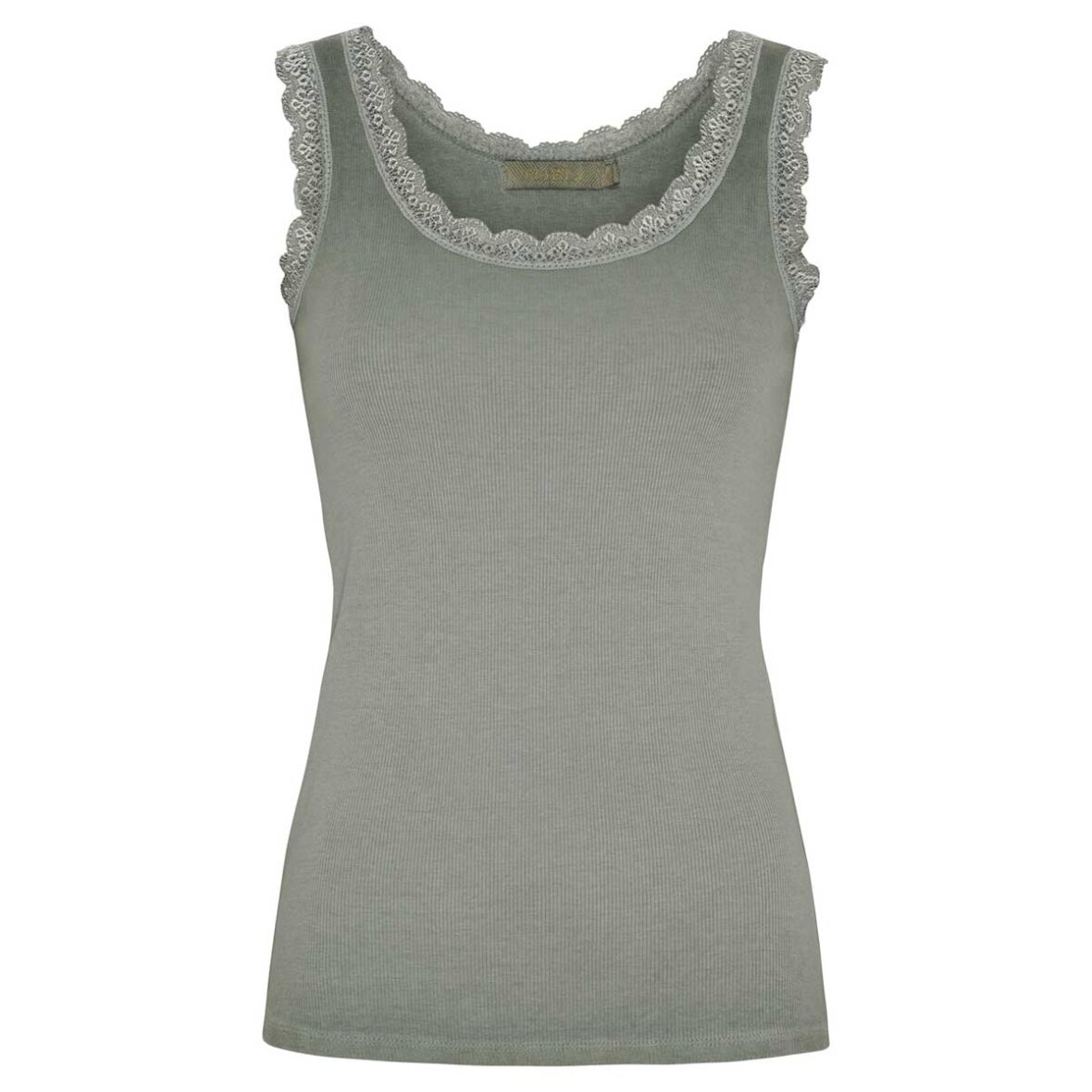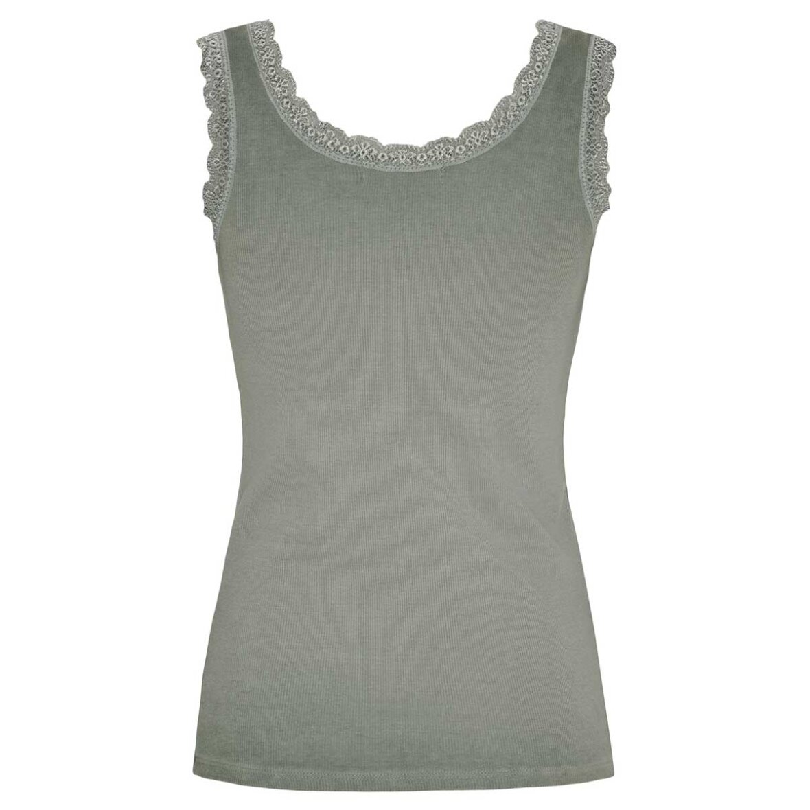 Tanktop med fine blondedetaljer langs hals og ærmegab. Perfekt som basislag eller alene på varme dage.