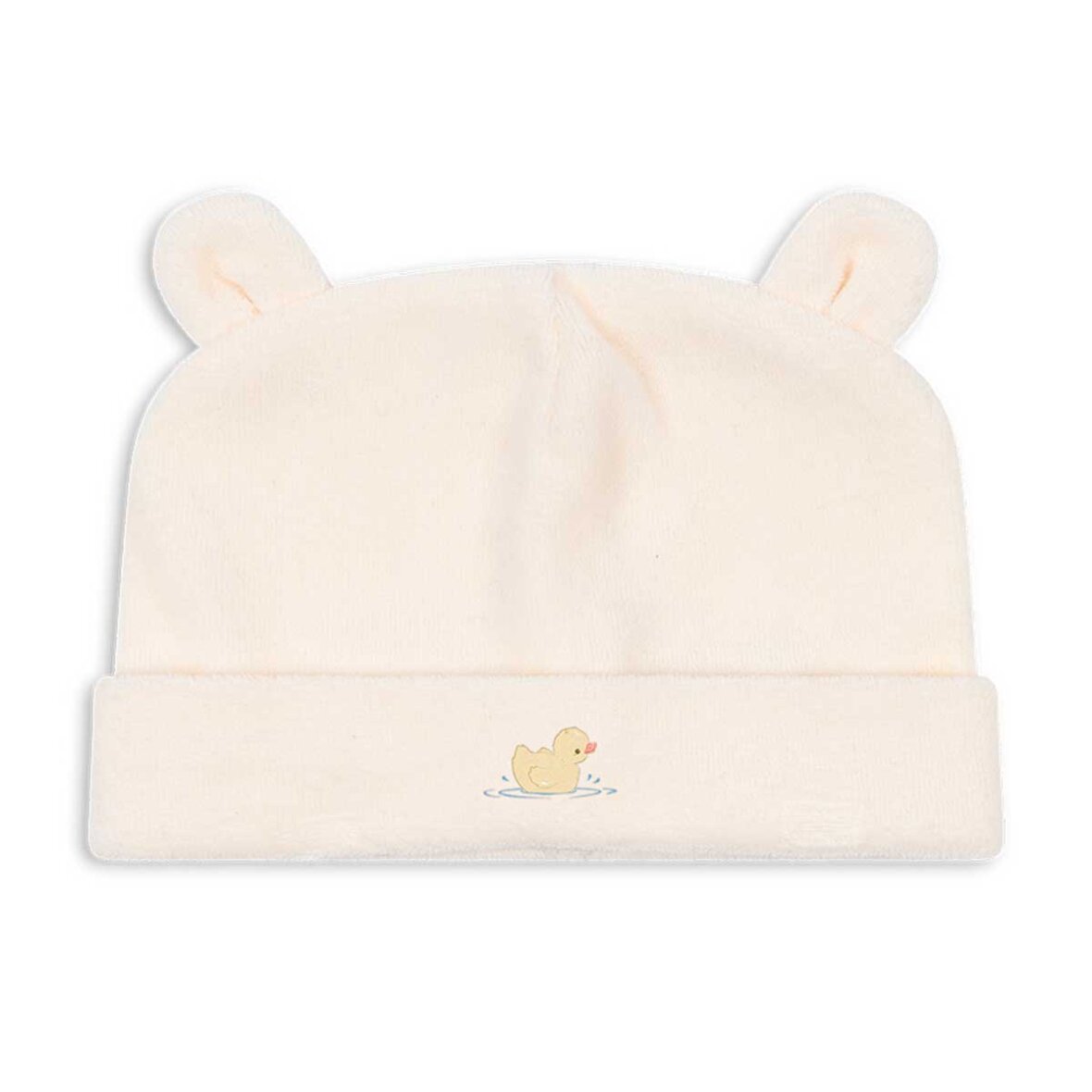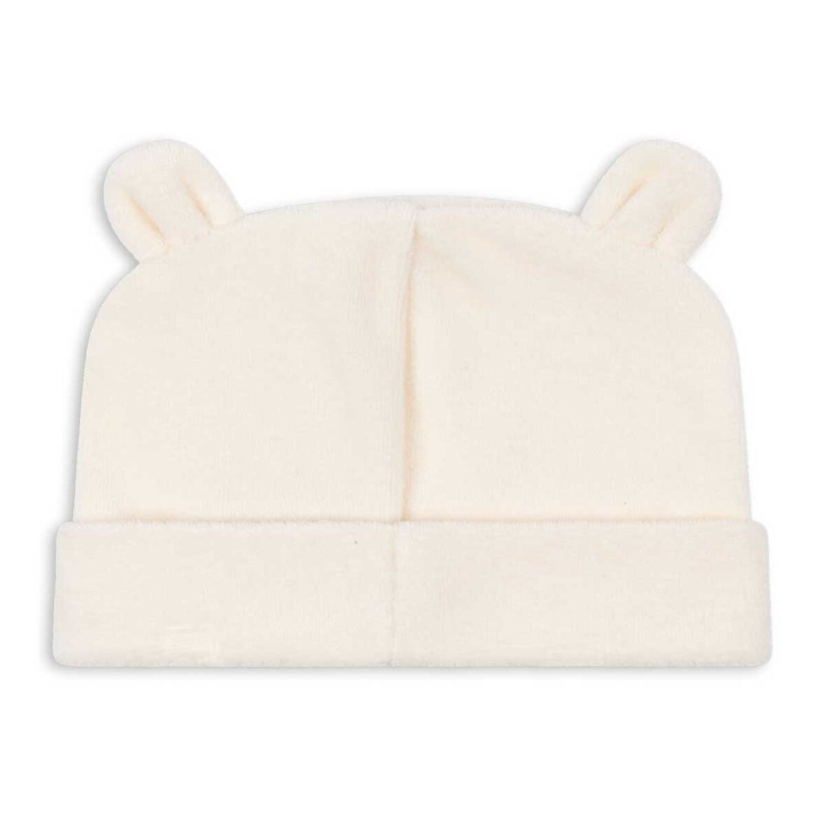 Denne bløde babyhue er fremstillet i en varm bomuldsblanding med en dejlig velouragtig overflade, der føles skøn mod den sarte hud.