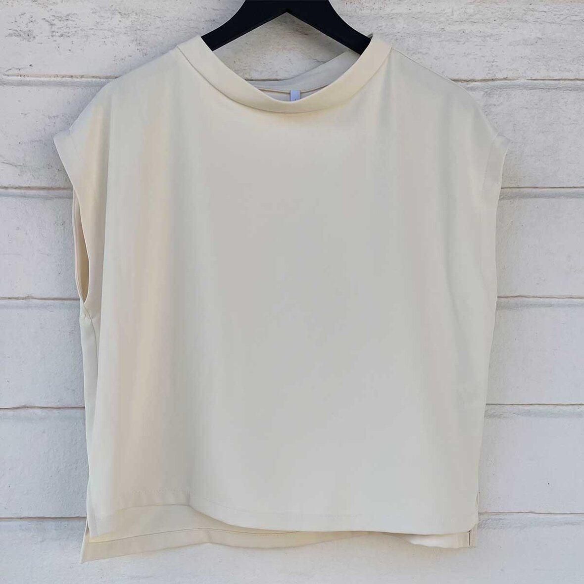 Top fra Imperial i lækker materiale. Toppen har kort ærmer, som kun lige dækker skulderen og uden skuldersøm. Toppen har et boxy fit. Den har en rund hals med en opretstående kant, som gør den mere speciel. Desuden har toppen et lille slids i begge sider.