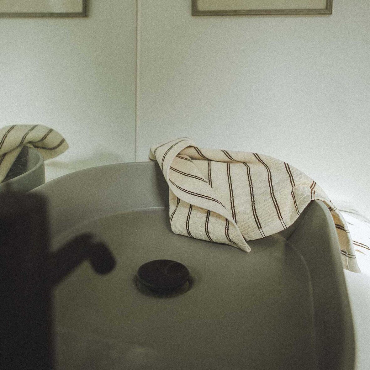 Kollektionen er tidløst designet i holdbare, naturlige materialer og smukke, afstemte farver. Håndklædet har et enkelt udtryk med smalle kanter og er tæt vævet for optimal sugeevne og lang holdbarhed.