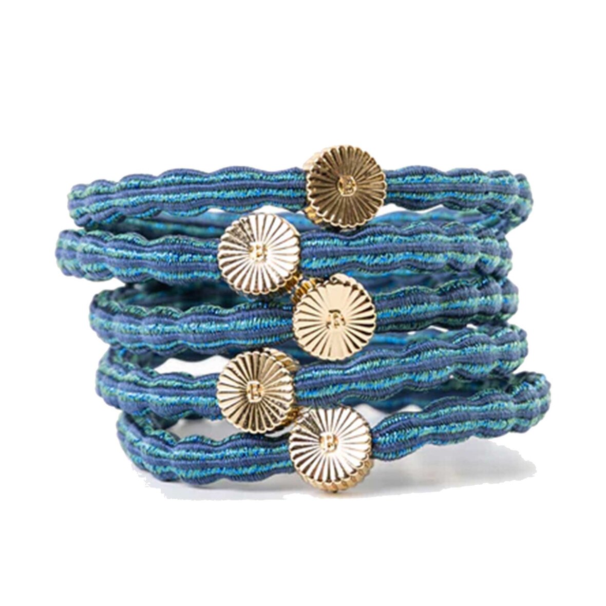 Tag bølgen af blå nuancer med 'Blueberry Swirl'-hårelastikken! Den er det perfekte valg til et sprudlende look, fuldendt af en gylden detalje, der glimter som solens stråler.