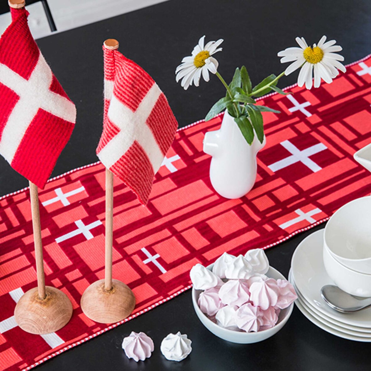 Smukt strikket flag i 100% merinould med striber i forskellige nuancer. Fod og knop er lavet af eg.