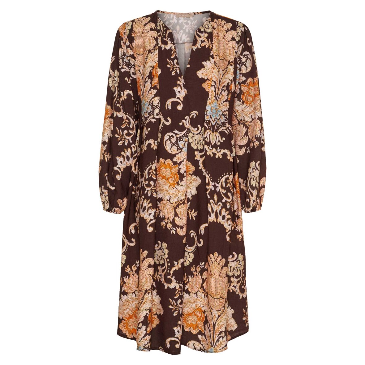 Brun kjole fra Marta Du Château med et smukt blomster- og paisleymønster i varme orange og blå nuancer. Kjolen har V-hals, 3/4-ærmer og en løs pasform, der giver et feminint og behageligt udtryk. En alsidig style, der både kan bruges til hverdag og festlige lejligheder.