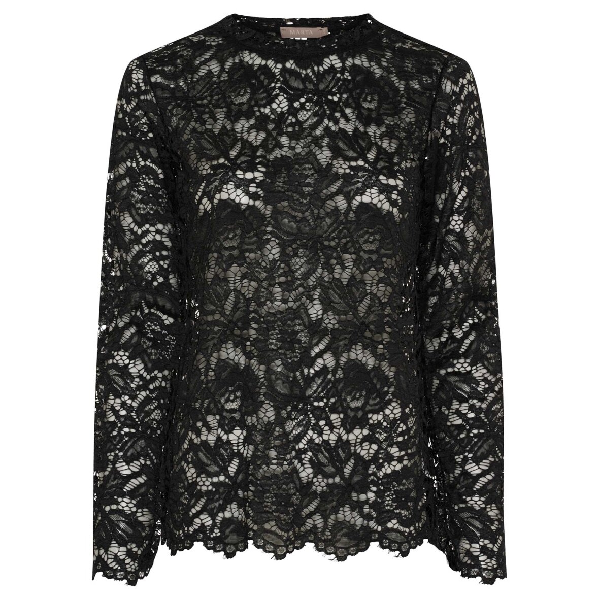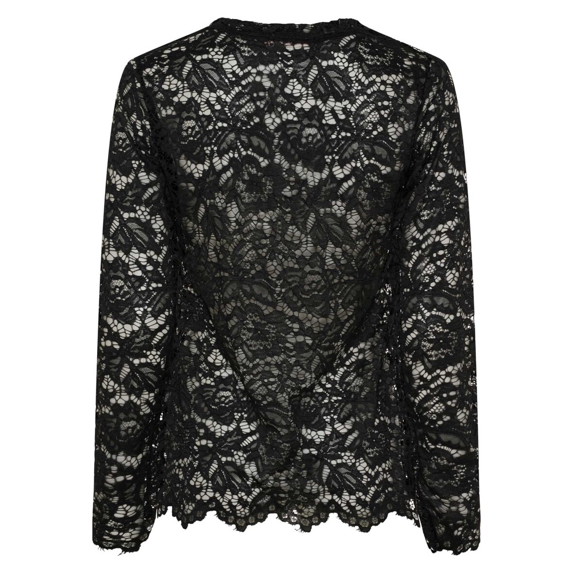 Smuk langærmet blondebluse med rund hals, der kombinerer elegance og enkelhed. Den kan styles både med nederdel og bukser for et sofistikeret og feminint look, perfekt til både hverdag og fest.