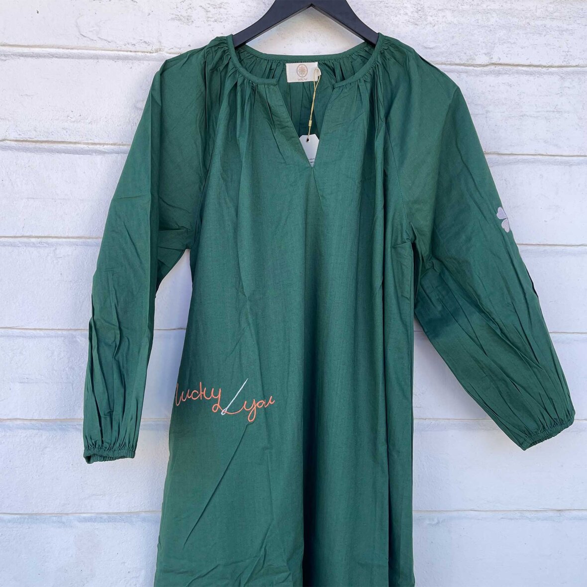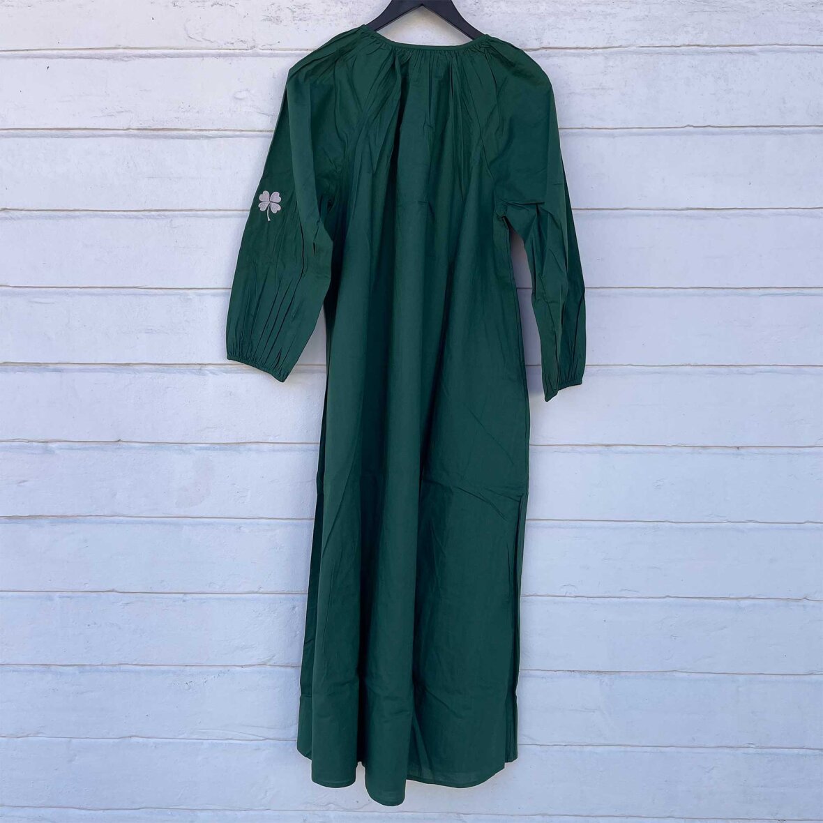 En lang kjole med smukke broderier, firkløvere og hestesko, som gør den både feminin og unik. Med lidt stumpede ærmer og en let længere bagkant får du et look, der både er stilfuldt og flatterende.