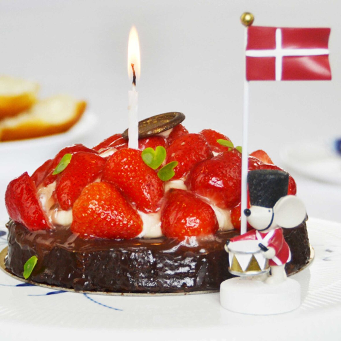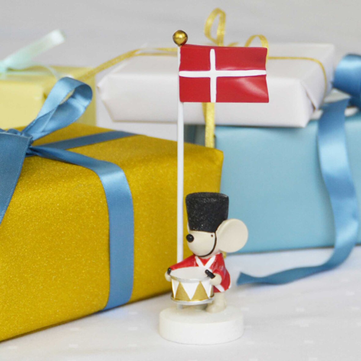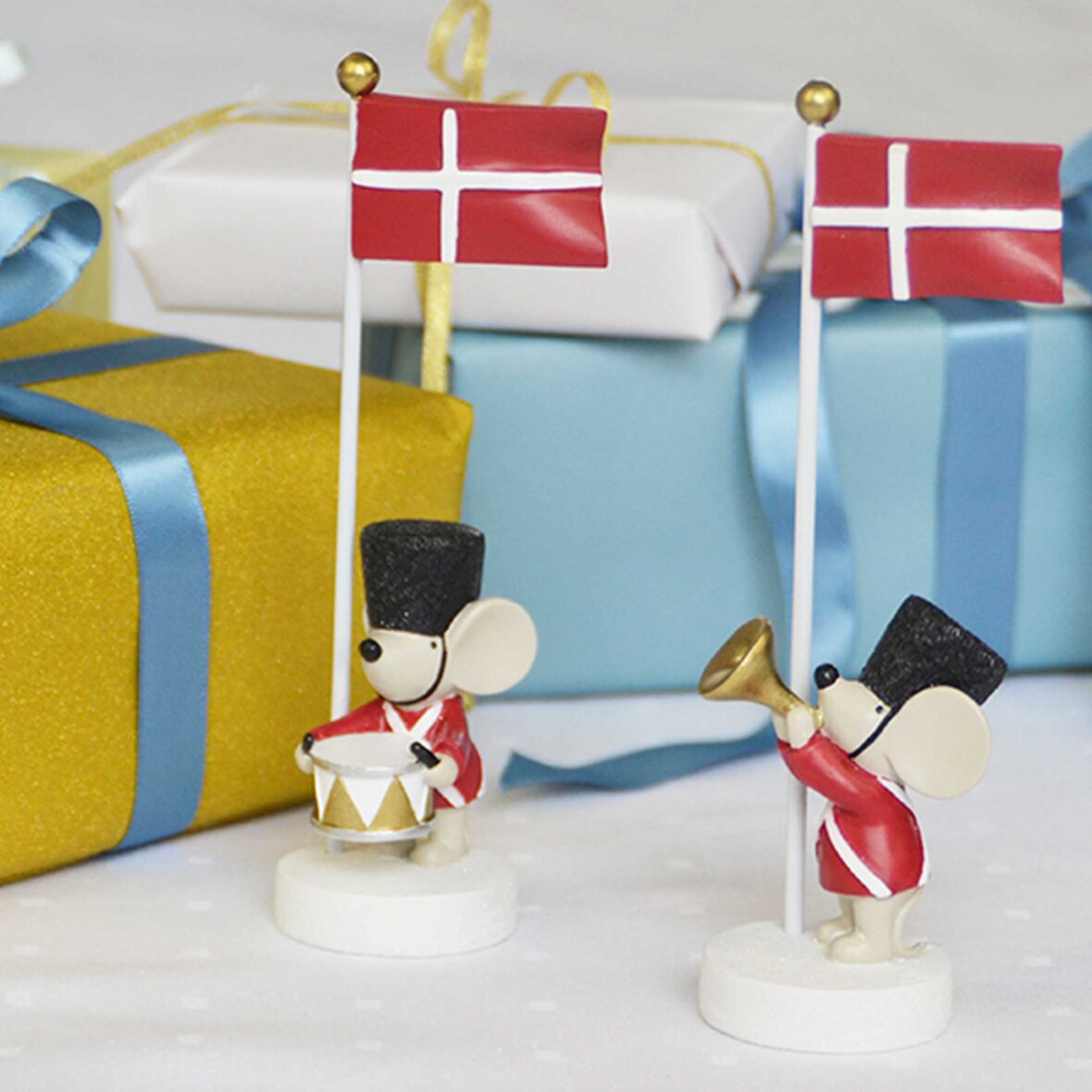 Dekorativt bordflag med en sød mus med tromme. Figuren er håndmalet og lavet i polyresin – perfekt som pynt til festlige anledninger.
