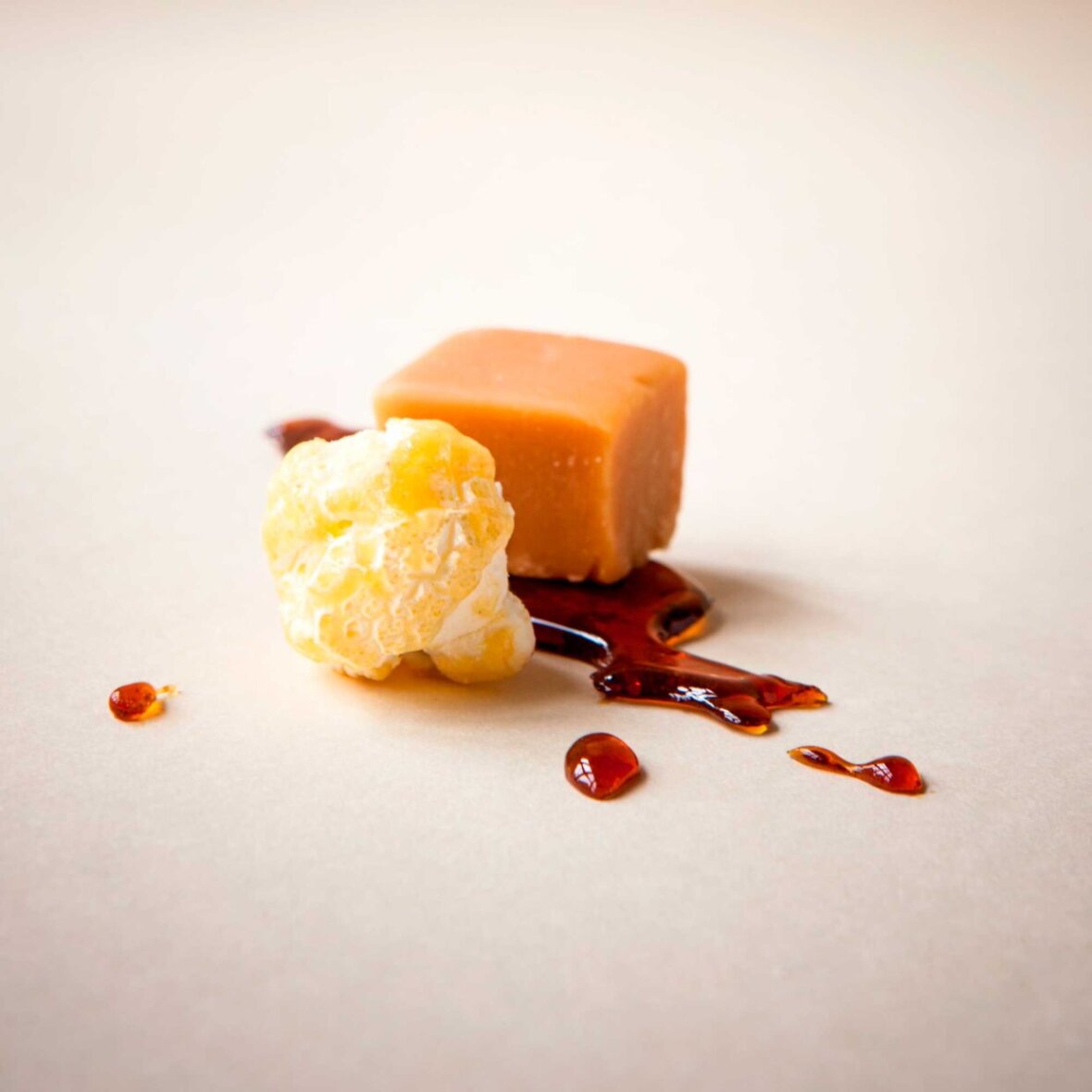 Ingredienser: Sukker, majs, glukosesirup, kokosfedt, smør (fløde, mælkesyrekultur), havsalt, vaniljesukker, soja-lecitin. Kan indeholde upoppede kerner og spor af mandel.