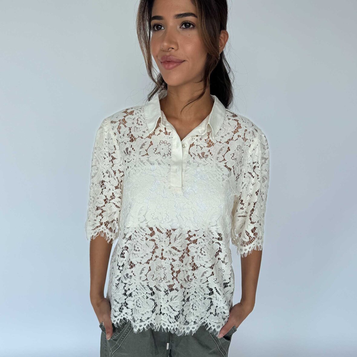 Elegant bluse fra Continue i off white med blondedetaljer. Blusen har krave og 3/4 lange ærmer, og kan nemt styles både til hverdag og festlige lejligheder.