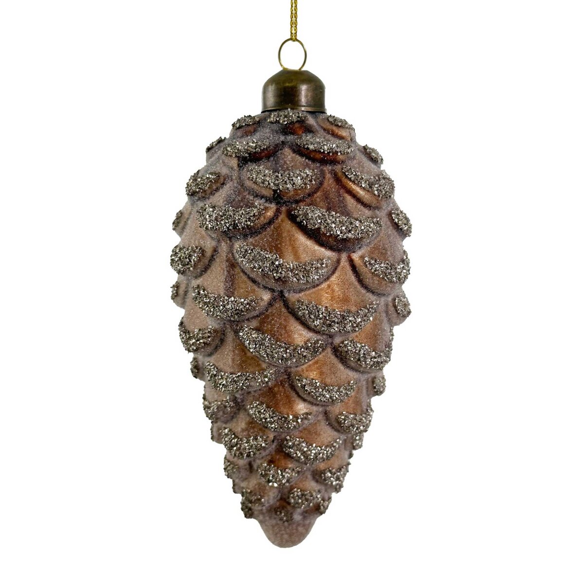 Glas-konisk dekoration med sukker-effekt i brun og sølvglimmer. Ideel til juledekorationer eller som pynt i hjemmet.