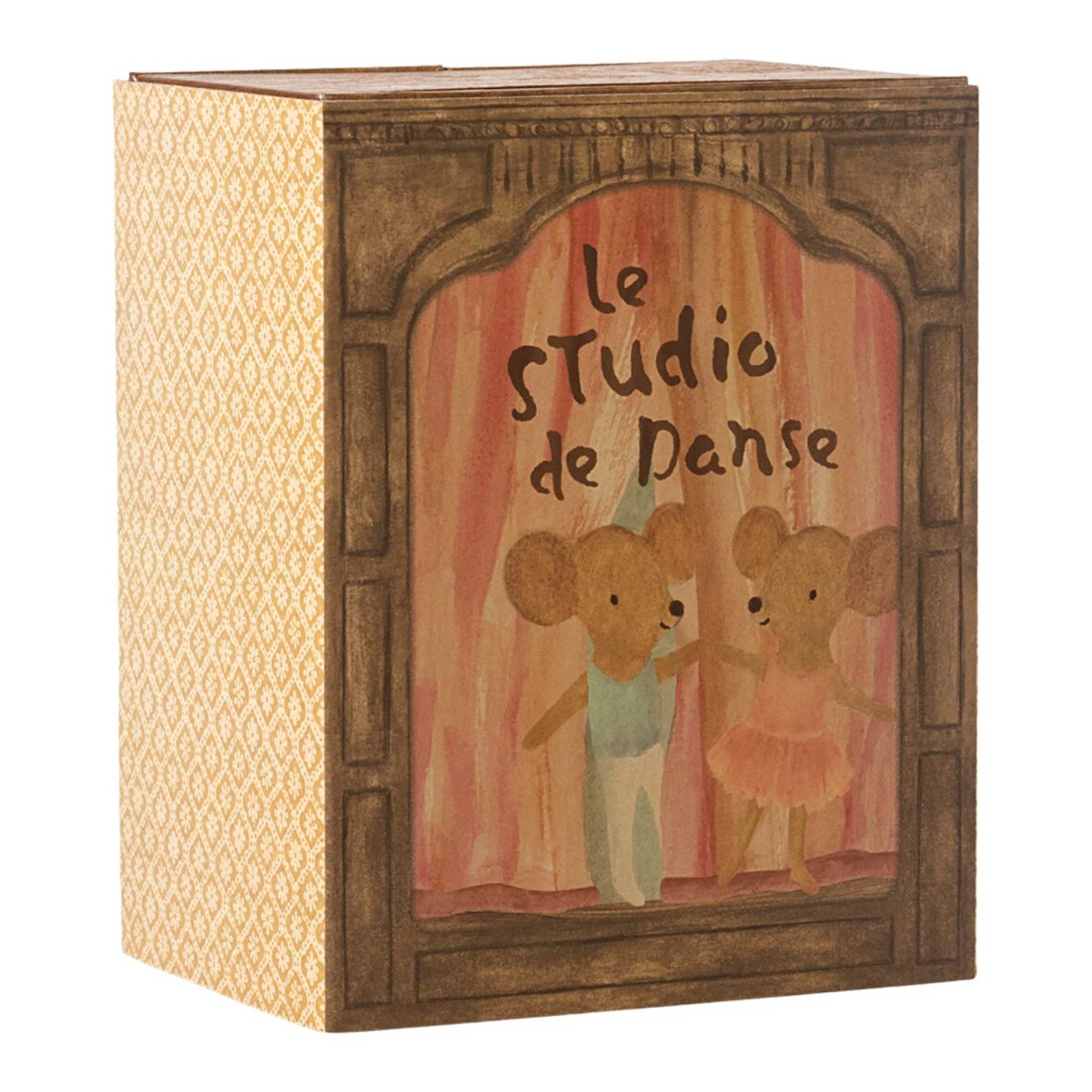 Magisk kasse med dansende mus, der kan bruges som både dansestudie og hyggeligt musehus. Sættet indeholder to påklædte mus til leg og historiefortælling.