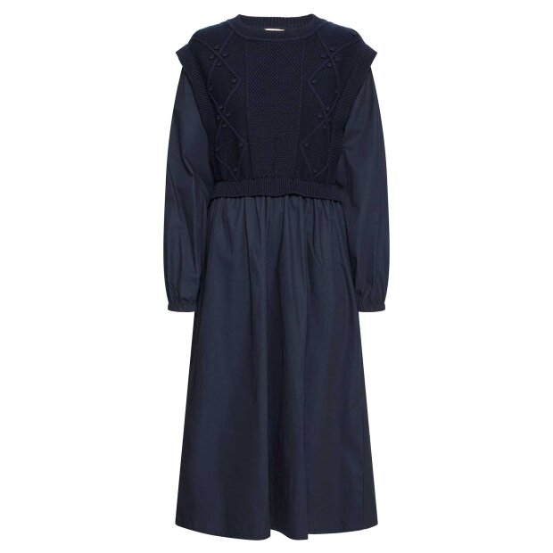 Smuk navyblå Belle kjole fra Atelier Rêve, skabt i et feminint og moderne design. Kjolen er designet med en strikket overdel, der giver et flot layered look og skaber en smuk kontrast til det enkle skørt. Den har rund hals, lange ærmer med elastik og en længde, der går til midt på underbenet – et snit, som giver et elegant og tidløst udtryk.